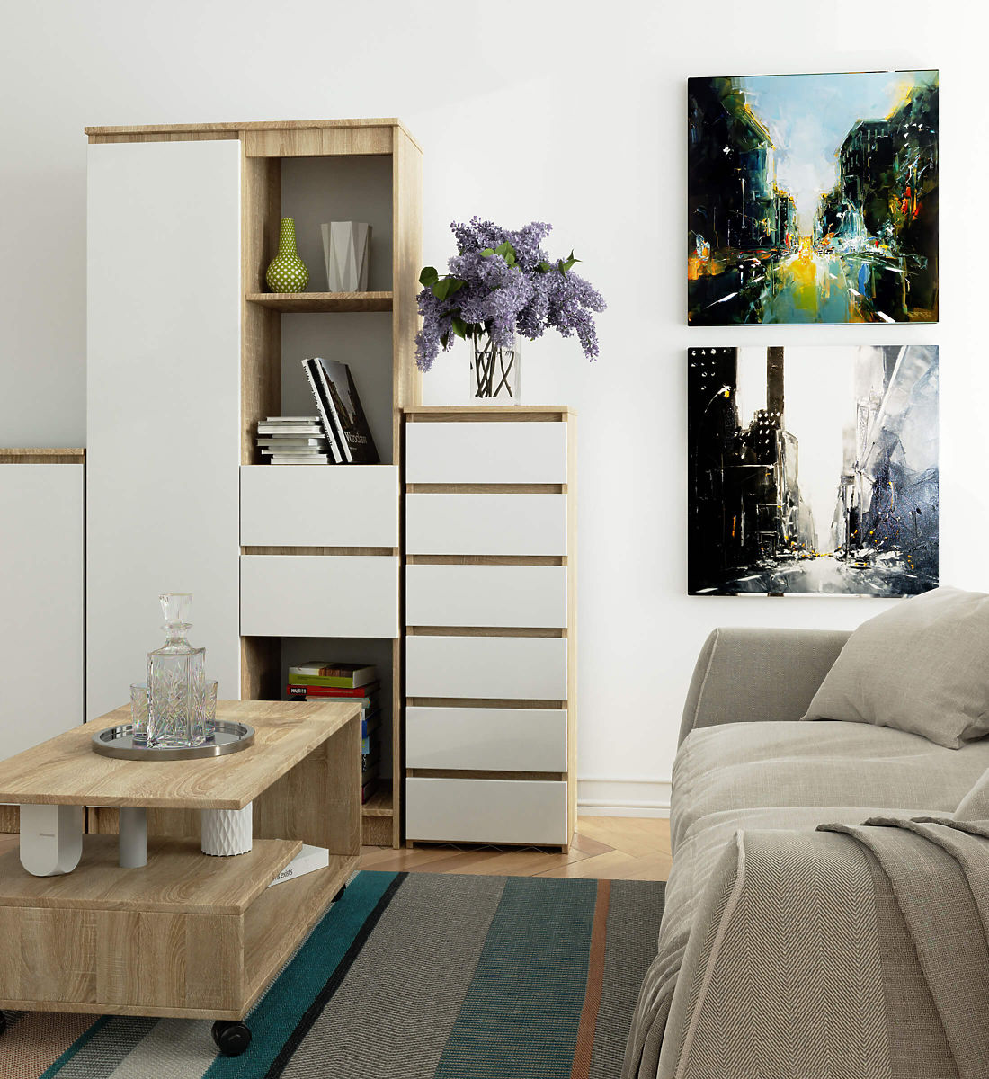 - Elegantes Aussehen - die Kommode ist schlicht in der Form und zeichnet sich durch die stilvolle Farbe Eiche Sonoma und weiße Fronten aus,