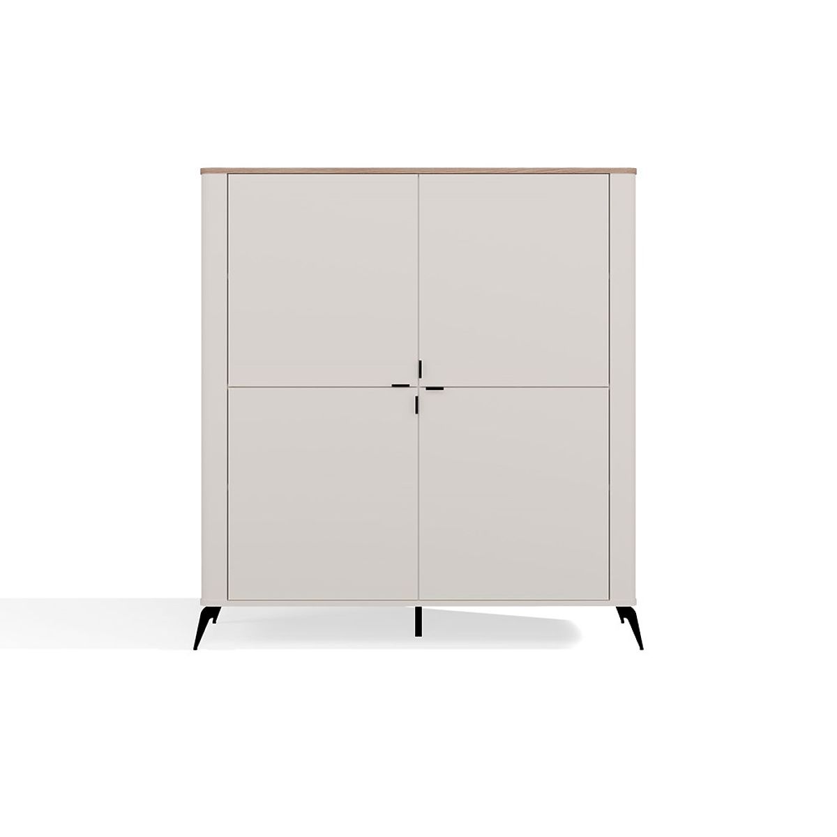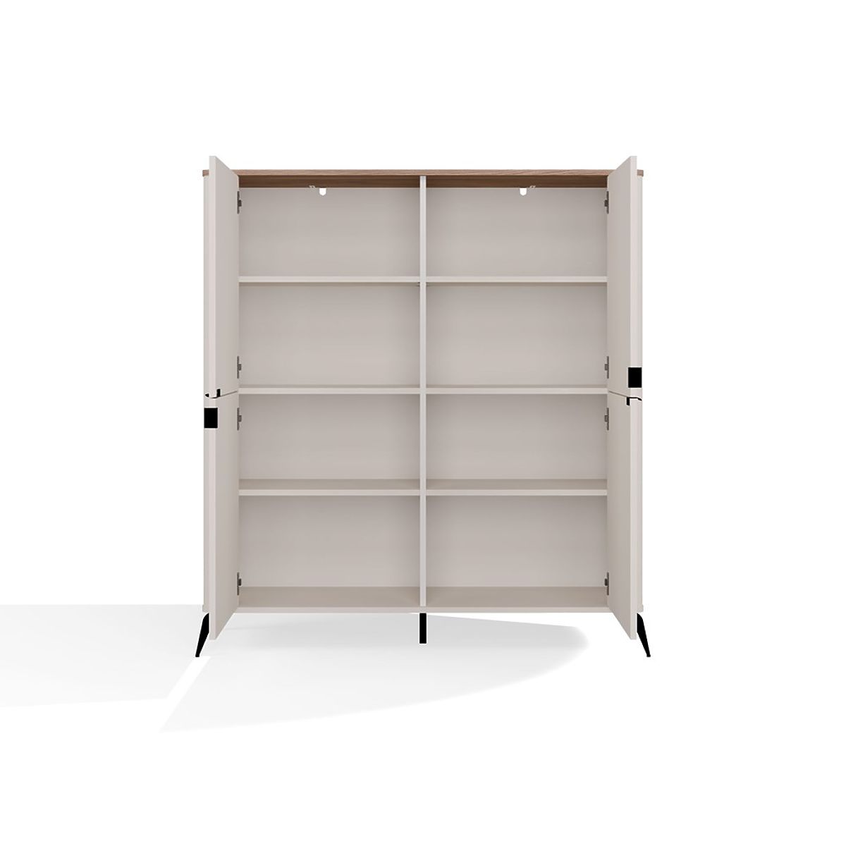Das Modell ist mit vier Fronten mit Soft-Close-Funktion ausgestattet, hinter denen sich bis zu acht praktische Regale verbergen – ideal zur Aufbewahrung von Büchern, Dokumenten, Textilien oder Alltagsgegenständen.