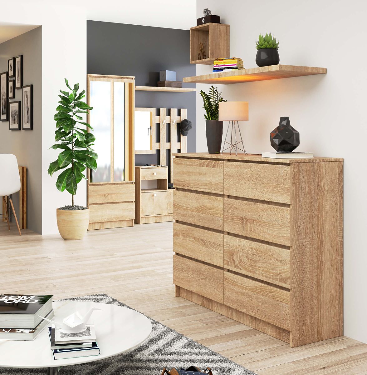 Acht Schubladen, die alle notwendigen Dinge im Raum aufnehmen können, und eine 120 Zentimeter breite Platte - das ist die Kommode K120 in der modischen Farbe Eiche Sonoma. Das hochwertige Produkt zeichnet sich durch eine stabile Konstruktion aus, die die Langlebigkeit des Produkts gewährleistet, sowie durch ein universelles Design. Ein weiterer Vorteil des funktionalen Möbels, das sich hervorragend im Wohnzimmer, Schlafzimmer, Esszimmer oder Büro macht, ist der attraktive Preis. In unserem Online-Shop können Kunden auch weitere Vorschläge für Inneneinrichtungen in der Farbe Eiche Sonoma erwarten, die sowohl im Büro als auch zu Hause mit ihrer Praktikabilität angenehm überraschen. Wir empfehlen, unser Angebot zu nutzen und ein Set zusammenzustellen, das auf die spezifischen Bedürfnisse zugeschnitten ist.