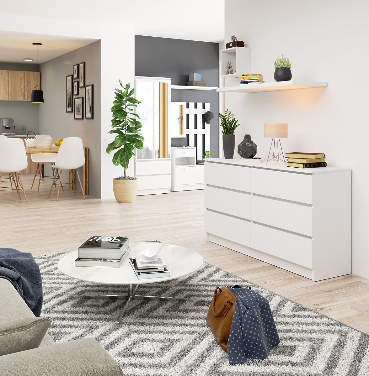 Die KOMMODE K140 6 SCHUBLADEN ist ein einfaches und minimalistisches Möbelstück. Sie passt perfekt in Räume mit modernem und skandinavischem Design, in denen helle Farben dominieren. Dieses weiße Möbelstück eignet sich ideal für das Wohnzimmer, Schlafzimmer, den Flur, aber auch für das Büro oder Arbeitszimmer. Ihre Höhe beträgt 77 cm, die Länge 140 cm und die Tiefe 40 cm.