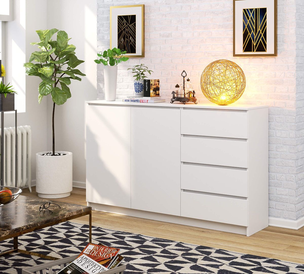 Die weiße Kommode zeichnet sich auch durch einen hohen praktischen Wert aus. Sie verfügt über 4 leicht zu öffnende Schubladen und 2 sehr große Regale. Eine solche Konstruktion sorgt für Komfort bei der Aufbewahrung und ist eine sehr funktionale Lösung. In der Kommode können Sie alle notwendigen Dinge aufbewahren und haben sie immer an einem Ort, in Reichweite.