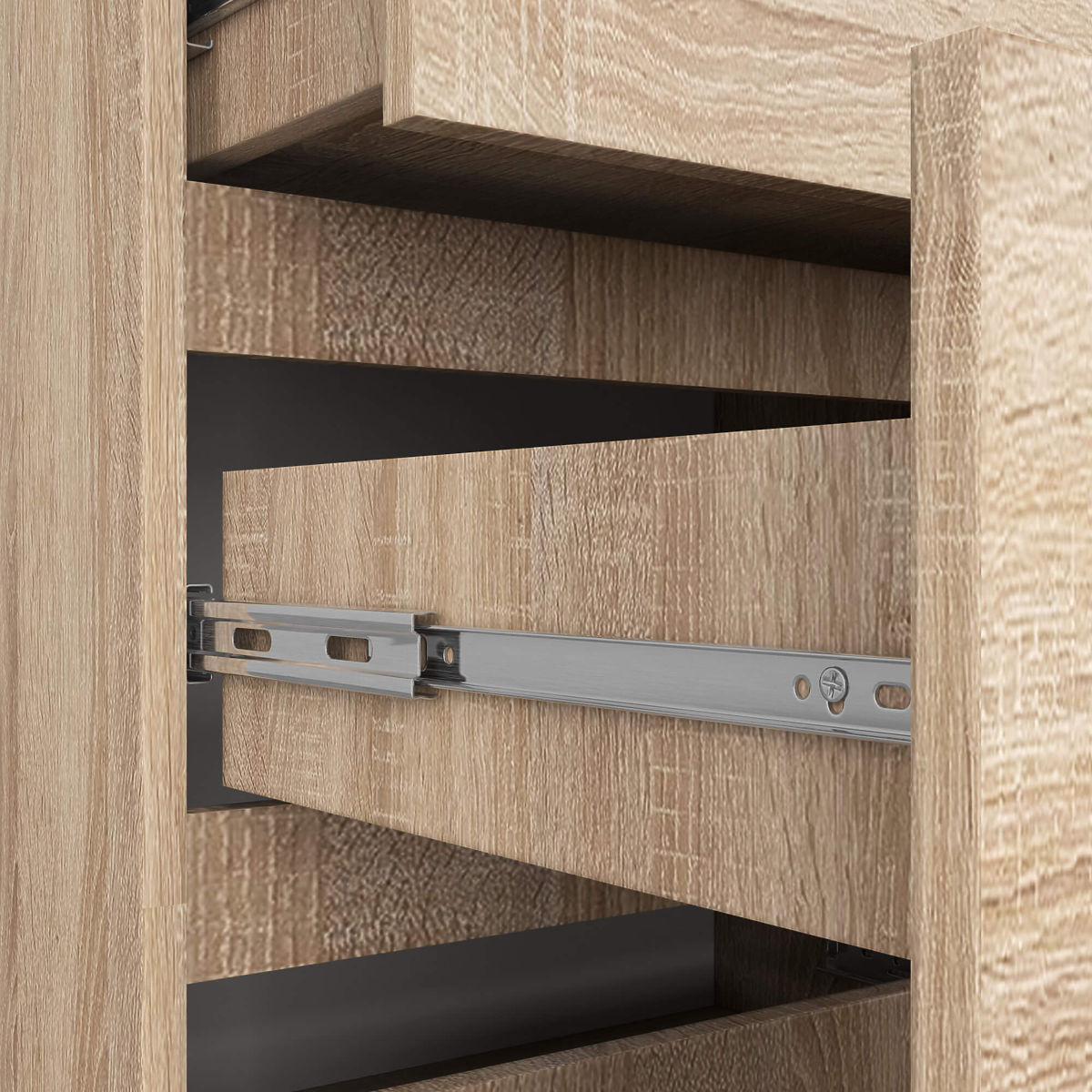 Zehn geräumige Schubladen sind der ideale Ort zur Aufbewahrung von Dokumenten, Boxen mit Kleinigkeiten oder Kleidung. Dies erleichtert die Ordnung in der Wohnung mehr denn je! Das sanfte Herausziehen und Einschieben der Schubladen wird durch Metallkugelführungen gewährleistet, sodass nichts klemmt und die Bewegung der Schublade reibungslos und leise ist.