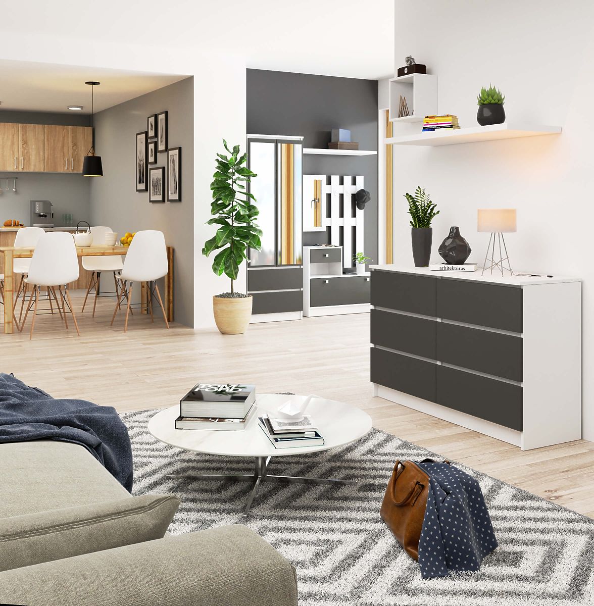 Kommode mit 6 Schubladen, weißem Korpus und graphitgrauen Fronten. .. mehr