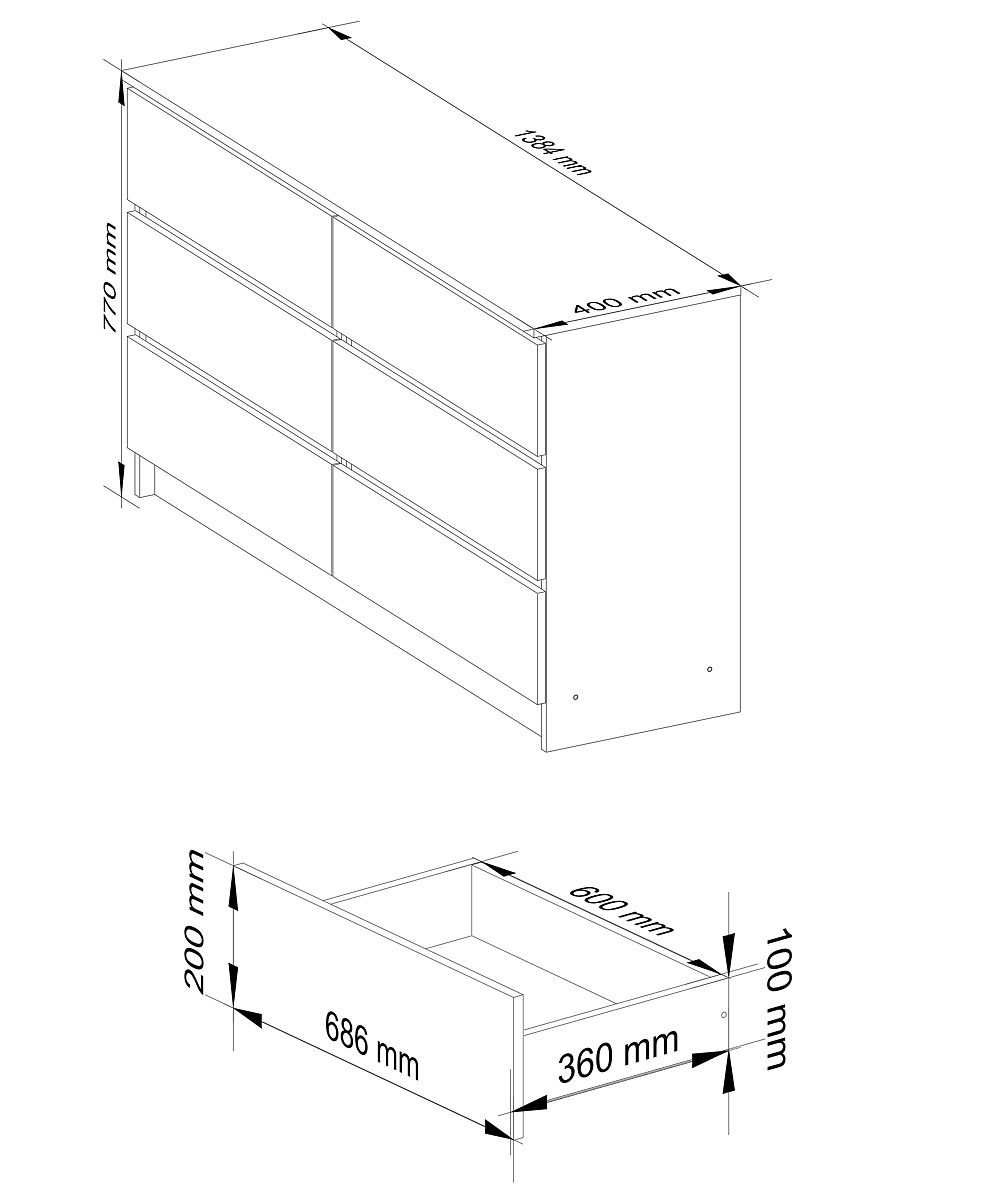 KOMMODE K140 MIT 6 SCHUBLADEN Hergestellt aus 16mm abriebfestem laminiertem Plattenmaterial.