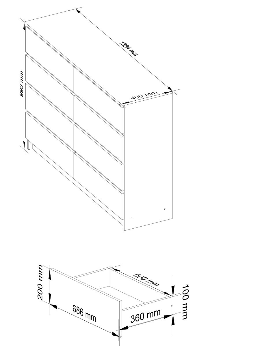 Hergestellt aus 16mm laminierten Platten von der Firma Kronospan. Die Kanten der Kommode sind mit ABS-Kante versehen, die die Widerstandsfähigkeit der Kommode gegen Beschädigungen erhöht.