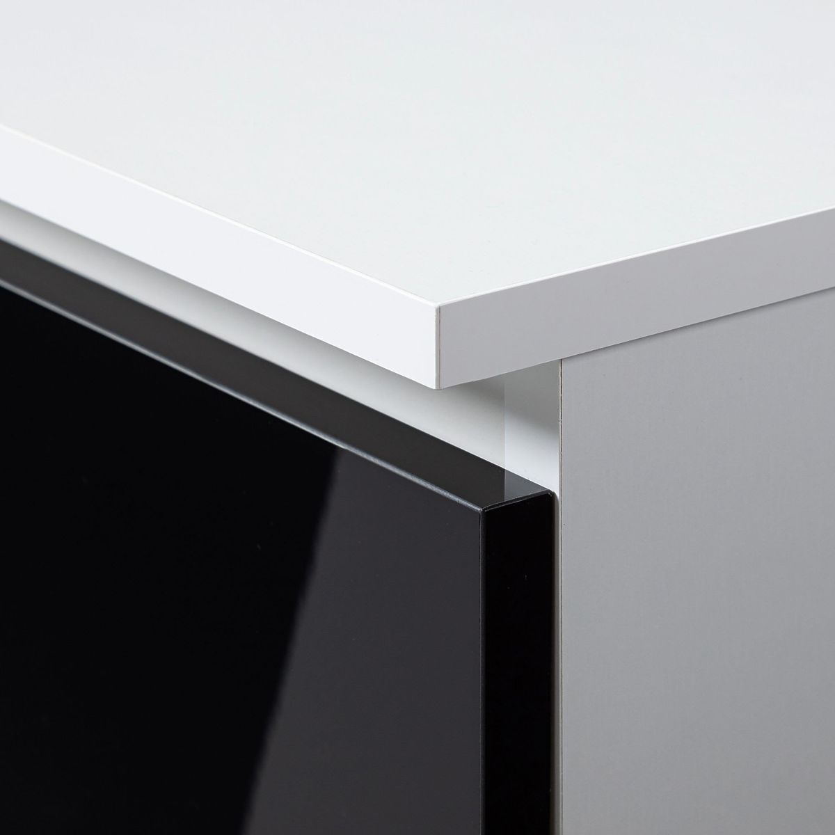 Korpus der Kommode aus 16mm laminierten Platten in Weiß Halbglanz, Fronten aus 19mm AKRYL-Platte Dekor Schwarz Hochglanz.