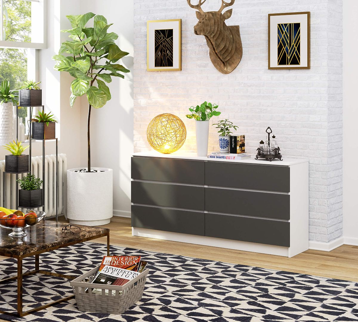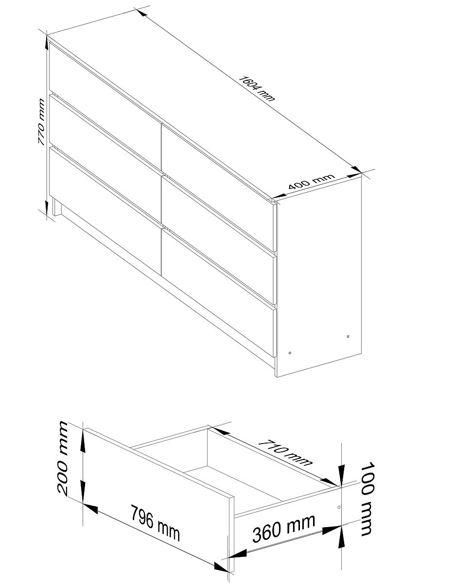 Die Kommode ist ein Möbelstück, das so vielseitig ist, dass es in jedem Raum verwendet werden kann. Am häufigsten findet man sie in Wohnzimmern, Kinderzimmern, Schlafzimmern, Esszimmern oder Büros. Die Kommode sollte optisch mit den anderen Möbeln im Arrangement harmonieren und sich durch solide und sorgfältige Verarbeitung sowie Funktionalität auszeichnen. Das vorgestellte Produkt K 160 cm ist ein modernes Modell in zeitlosem Ton gehalten. Die Kombination aus Weiß und Grafitgrau wird zweifellos Personen ansprechen, die einen minimalistischen Stil und skandinavisch eingerichtete Innenräume bevorzugen. Die Kommode ist mit sechs geräumigen Schubladen ausgestattet. Sie lässt sich leicht öffnen und schließen. Sie findet sowohl in Wohn- als auch in Büroräumen Anwendung.