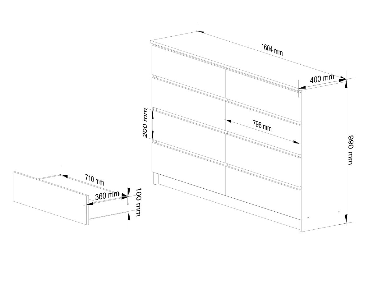 KOMMODE K 160cm mit 8 Schubladen aus 16mm abriebfestem laminiertem Plattenmaterial.