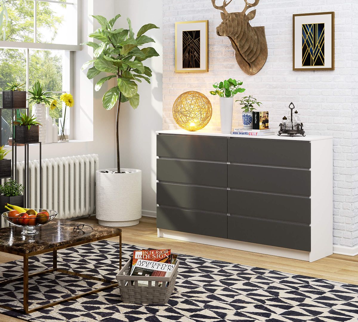 Kommode mit 8 Schubladen aus weißem und grauem Material. .. mehr