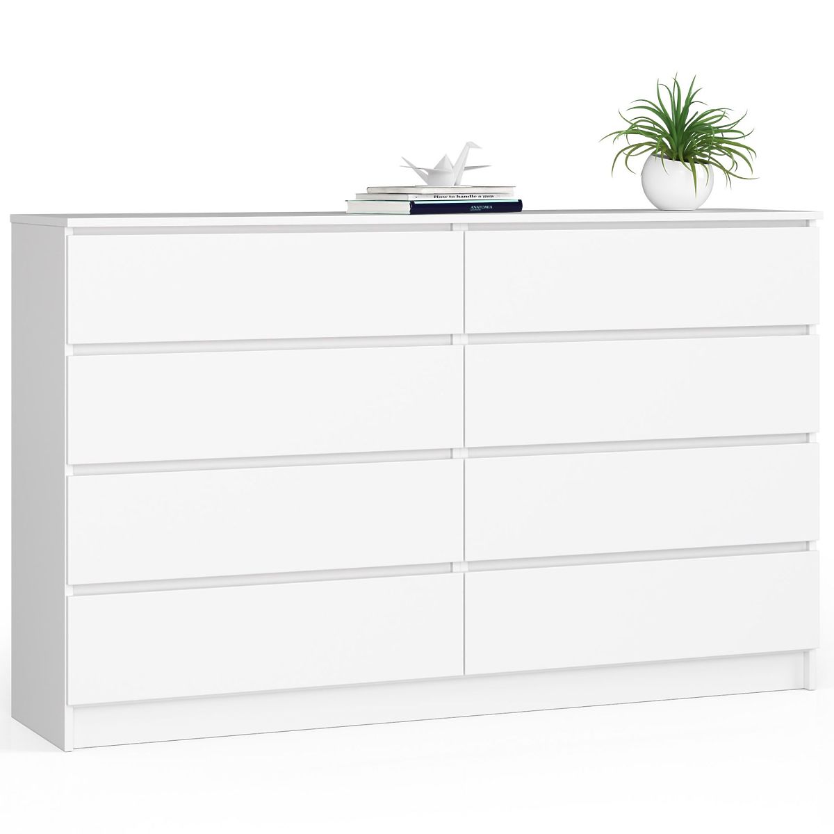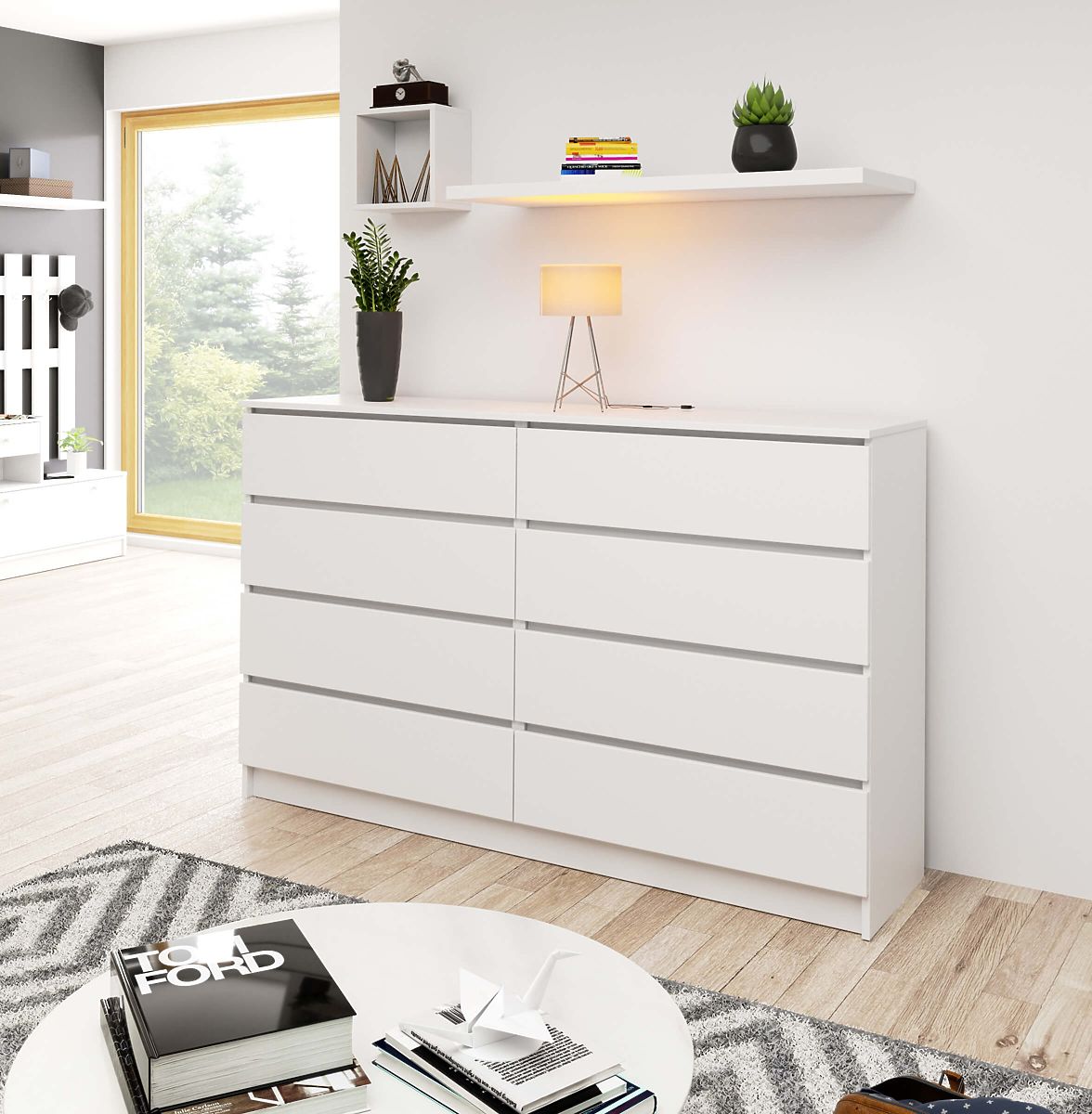 Die weiße Kommode ist für alle gedacht, die Komfort und Funktionalität schätzen. Dies spiegelt sich in der Konstruktion wider, die aus 8 breiten und tiefen Schubladen besteht. Diese Lösung ist sehr praktisch, da sie die Aufbewahrung einer großen Menge an Kleidungsstücken ermöglicht und somit viel Platz im Schrank spart.