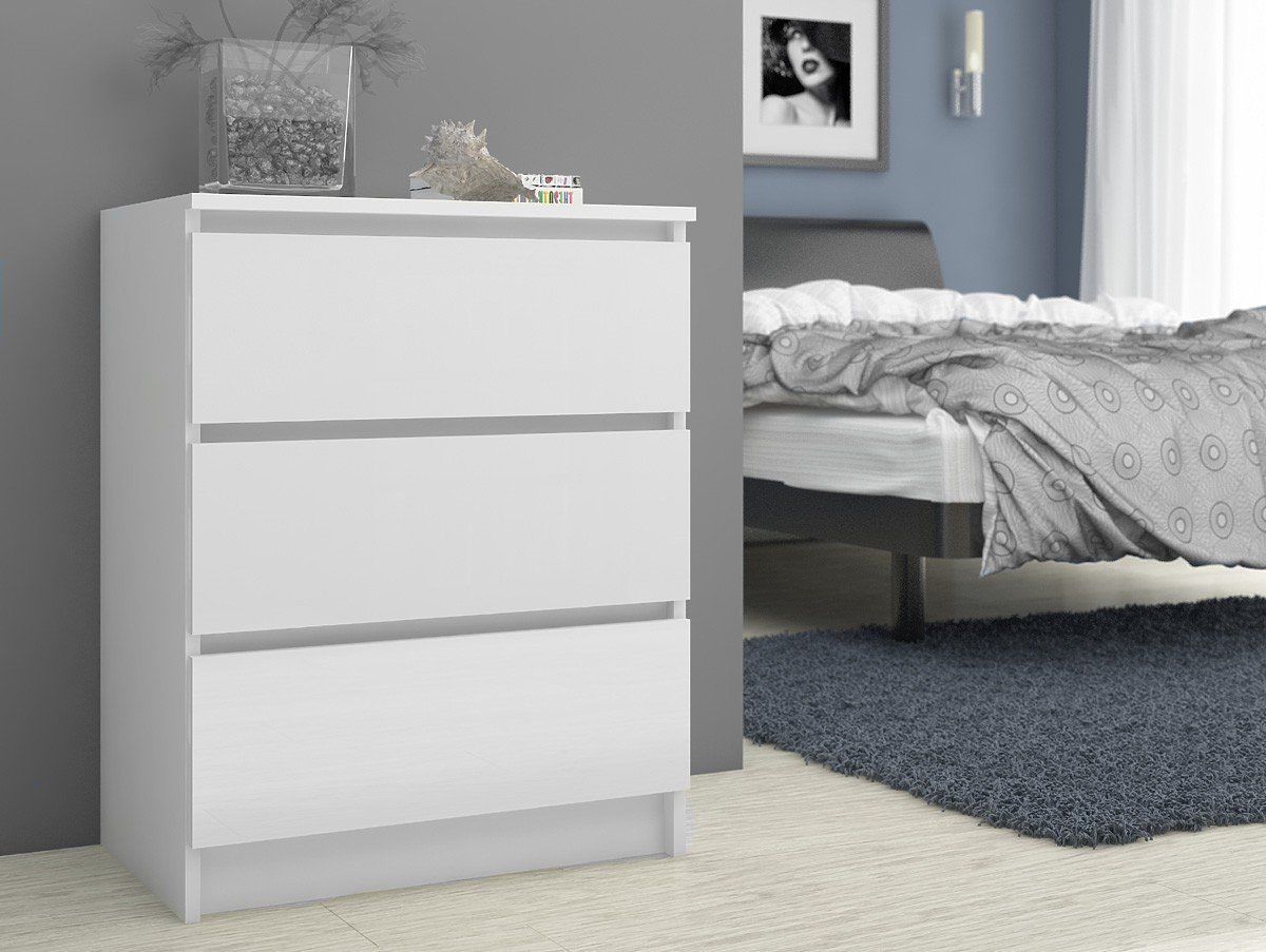 Die Schönheit liegt in der Einfachheit, dessen sind wir uns bewusst, und deshalb bieten wir Ihnen die schönsten Möbelstücke für Ihr Zuhause an. Eines unserer Angebote ist die effektvolle weiße Kommode 60cm, die Liebhaber des skandinavischen Stils sicherlich erfreuen wird. Weiße Möbel sind in letzter Zeit sehr beliebt - kein Wunder: Sie kombinieren praktische Nutzung, Vielseitigkeit und attraktives Aussehen. Die weiße Kommode mit 3 Schubladen ist ein Vorschlag, der sich hervorragend für Wohnzimmer, Schlafzimmer, Kinder- und Gästezimmer, Esszimmer und viele andere Räume eignet. Sie kann auch erfolgreich im Büro verwendet werden. Drei praktische Schubladen bieten ausreichend Platz für alle notwendigen Gegenstände. Die Kommode ist aus 16mm laminiertem Plattenmaterial gefertigt, das sich durch erhöhte Abriebfestigkeit auszeichnet. Die Kanten sind mit einer ABS-Kante versehen. Wir empfehlen, unser Angebot zu nutzen.