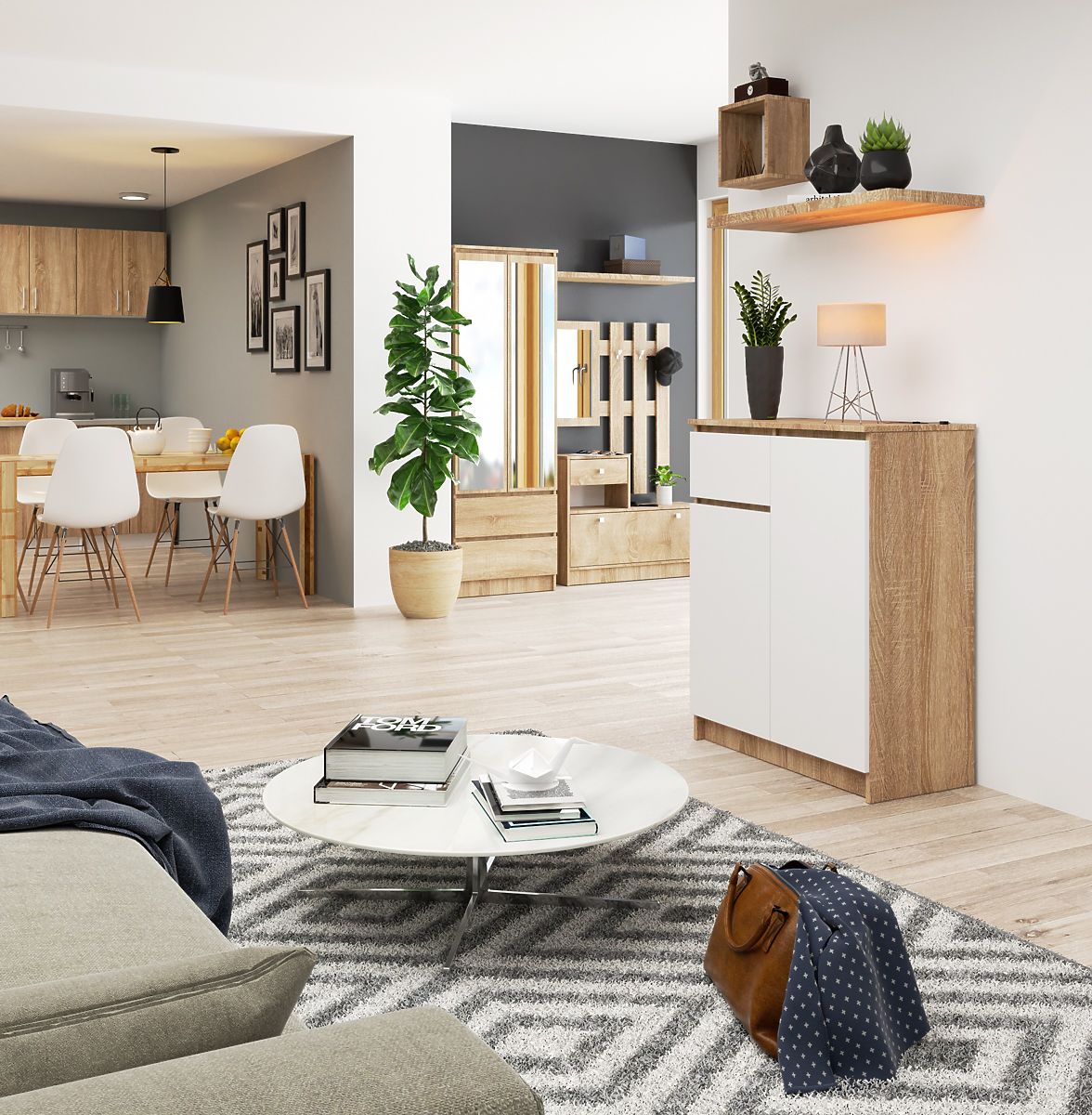Die kleine Kommode ist ein Einrichtungselement, das in jedem Raum Verwendung findet. Helle Farben, stabile Konstruktion und präzise Verarbeitung führten zur Schaffung eines Schranks, der sich beispielsweise für den Flur, das Wohnzimmer oder das Kinderzimmer eignet, aber auch für das Schlafzimmer. Sie kann auch im Büro verwendet werden, wo sie die Aufbewahrung vieler Dokumente und anderer Bürobedarf ermöglicht. Die Kommode besteht aus zwei verschließbaren Schränken (jeweils mit zwei Regalen) und einer Schublade. Das Möbelstück kombiniert modische Farbgebung - Weiß und Eiche Sonoma.