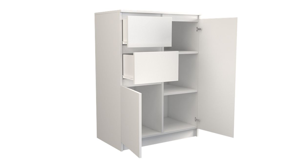 Das Innere der Kommode besteht aus Regalen und zwei Schubladen, die bei der Organisation von Gegenständen helfen. Es wird einfacher sein, das Gesuchte zu finden.