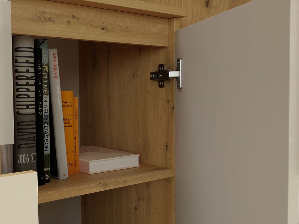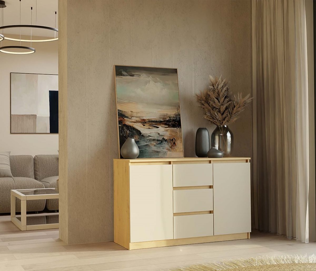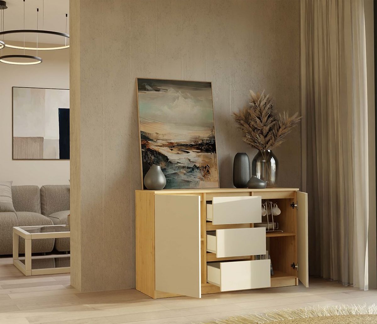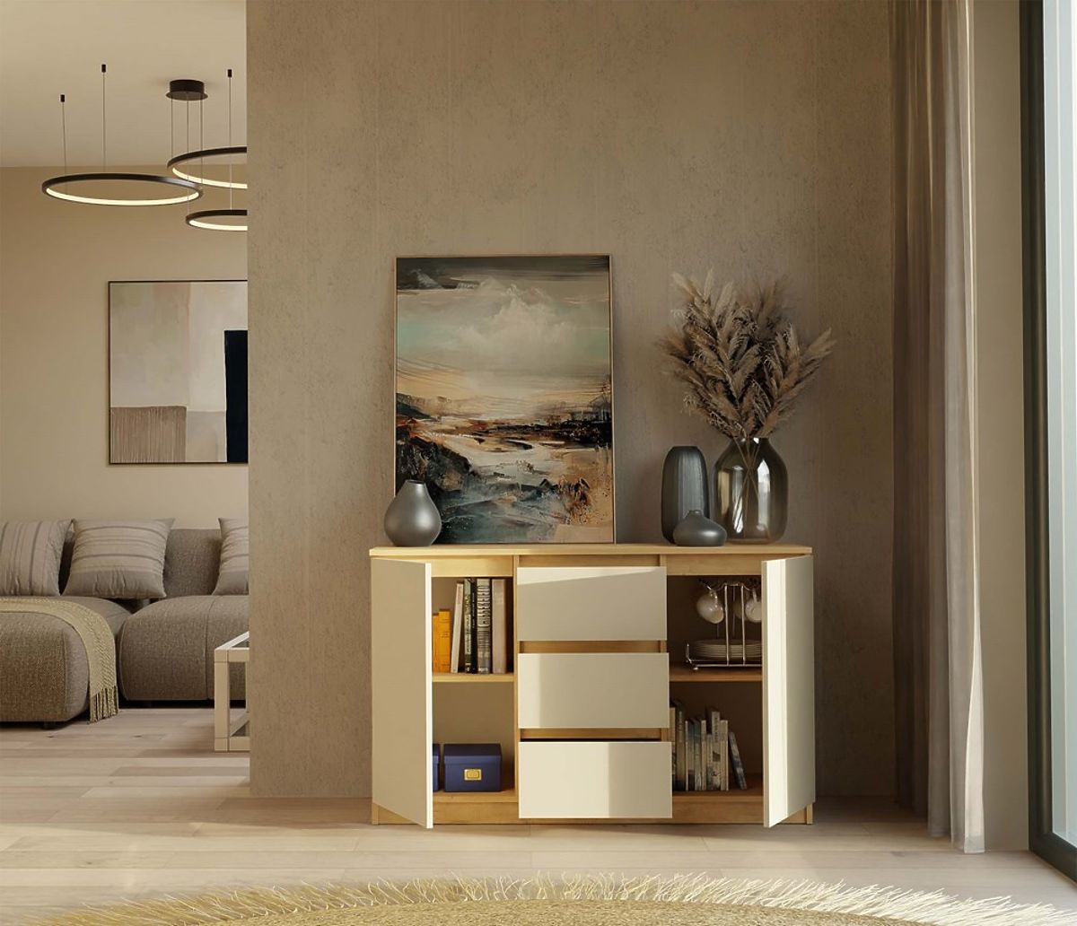 Stilvolle Kommode mit 2 Türen und 3 Schubladen in Eiche Artisan und Kaschmir. .. mehr