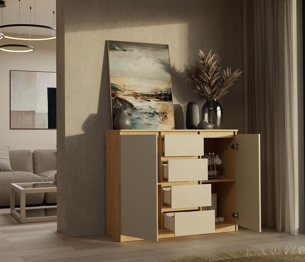 Große Kommode mit 2 Türen und 4 Schubladen in Eiche Artisan und Kaschmir. .. mehr