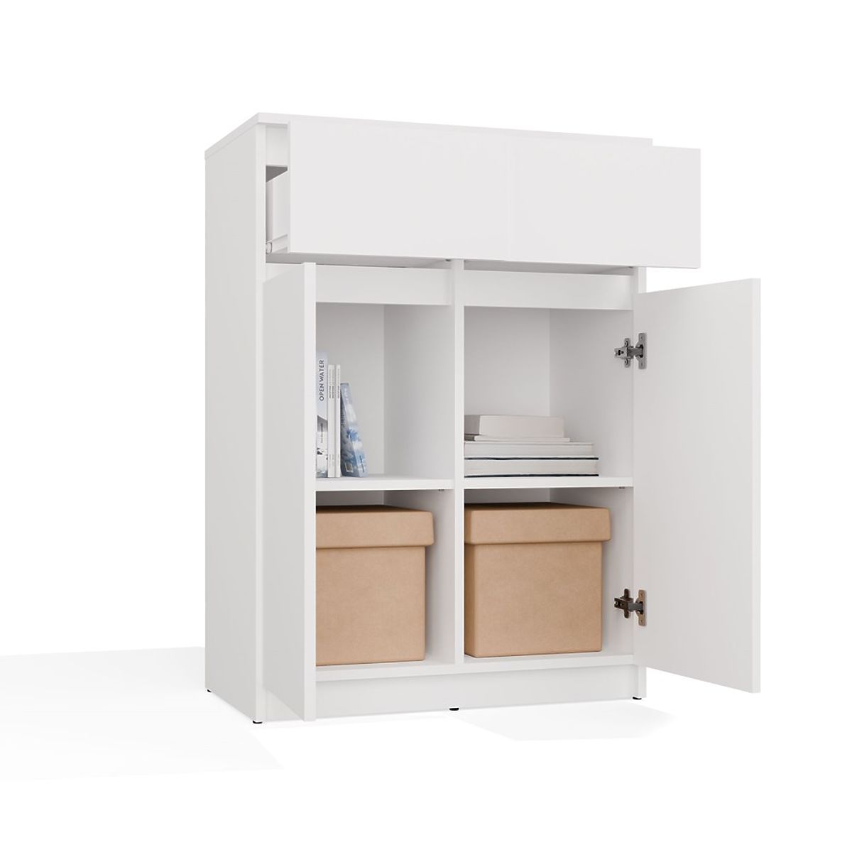 Weiße Kommode mit 2 Türen und 2 Schubladen für vielseitigen Stauraum. .. mehr