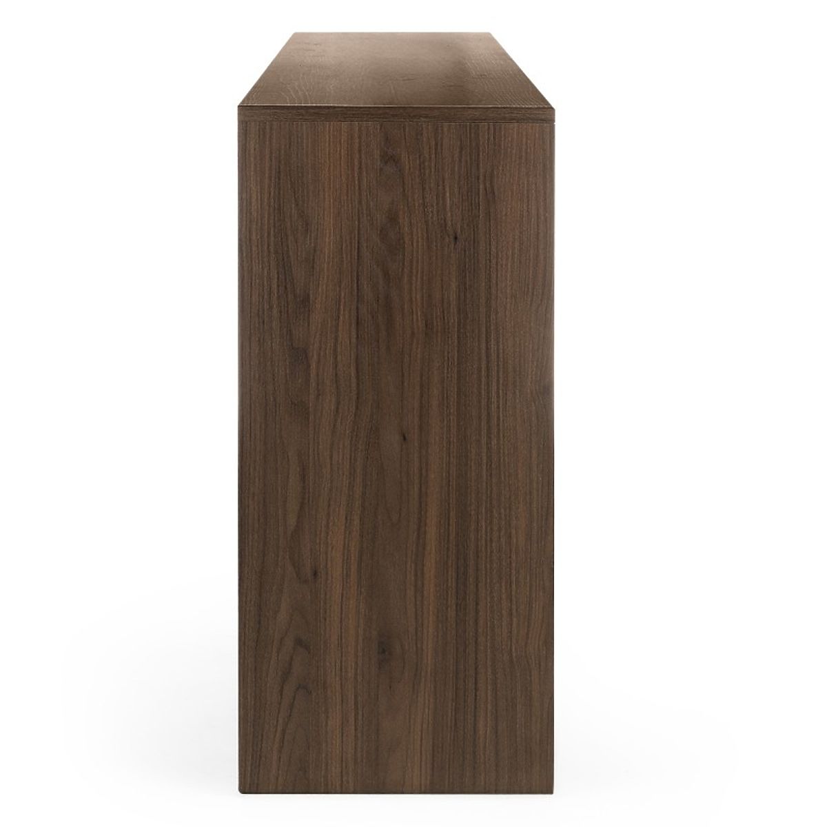 Die vier-türige Kommode Moku kombiniert minimalistisches Design mit Funktionalität. Die einzigartige Abrundung der Frontflächen und die Farbe Walnuss Villa verleihen ihr Leichtigkeit und Eleganz, was sie für jedes Interieur geeignet macht.