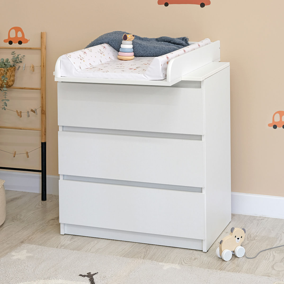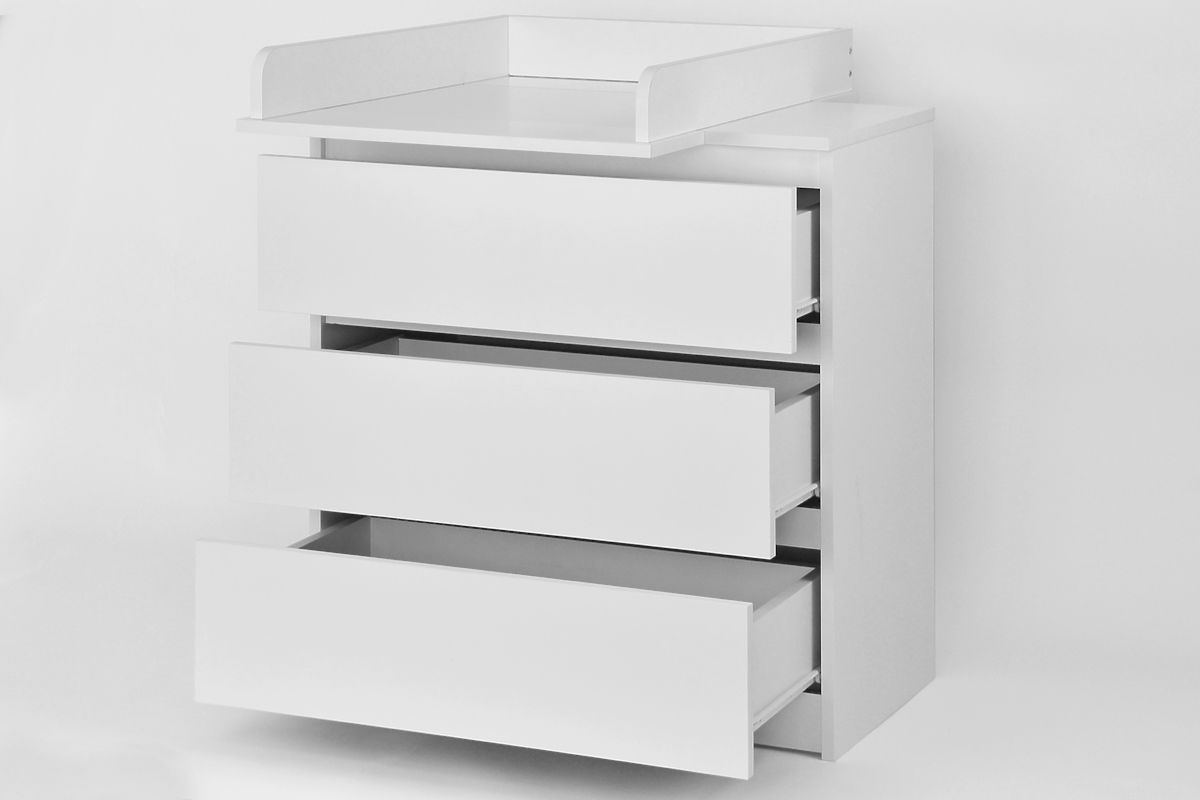 Weiße Wickelkommode mit drei Schubladen und Wickelfläche. Die obere Wickelplatte kann leicht demontiert werden, sodass die Kommode auch im Zimmer eines Schulkindes verwendet werden kann.
