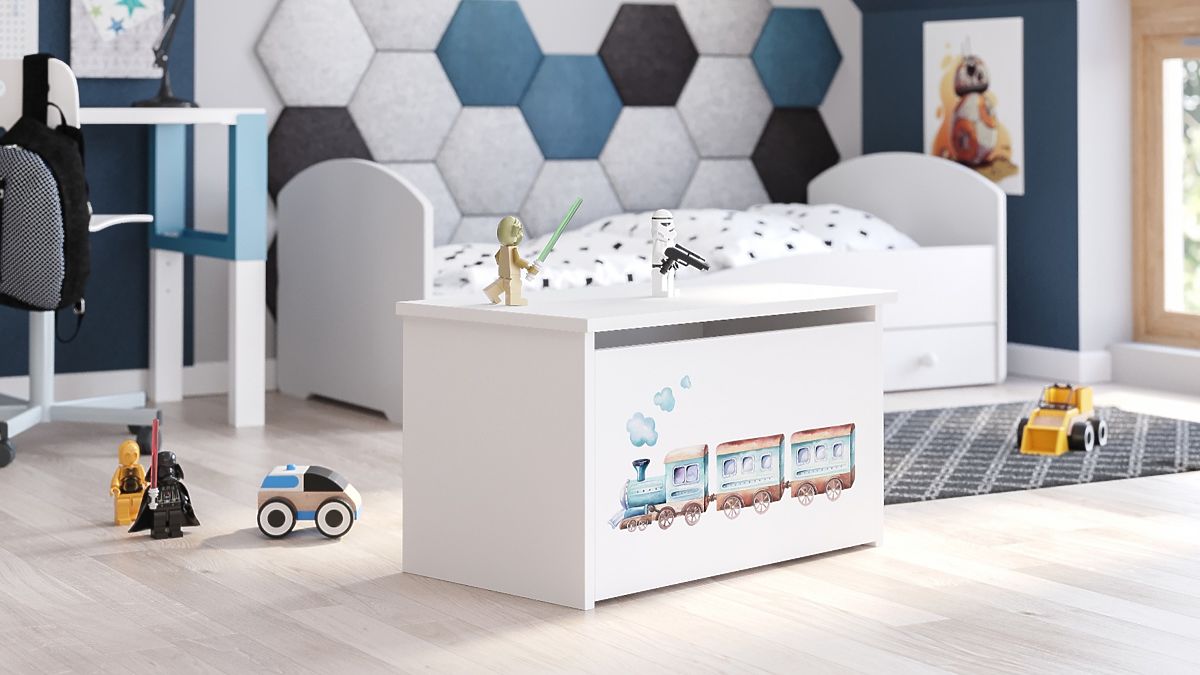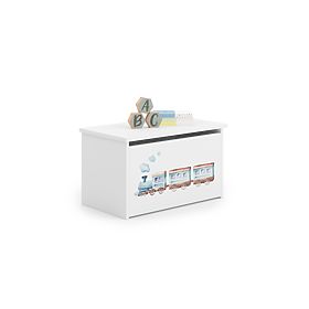 Geräumige Spielzeugtruhe mit kindlichem Zugmotiv und sicherem Gasdruckfedermechanismus. .. mehr