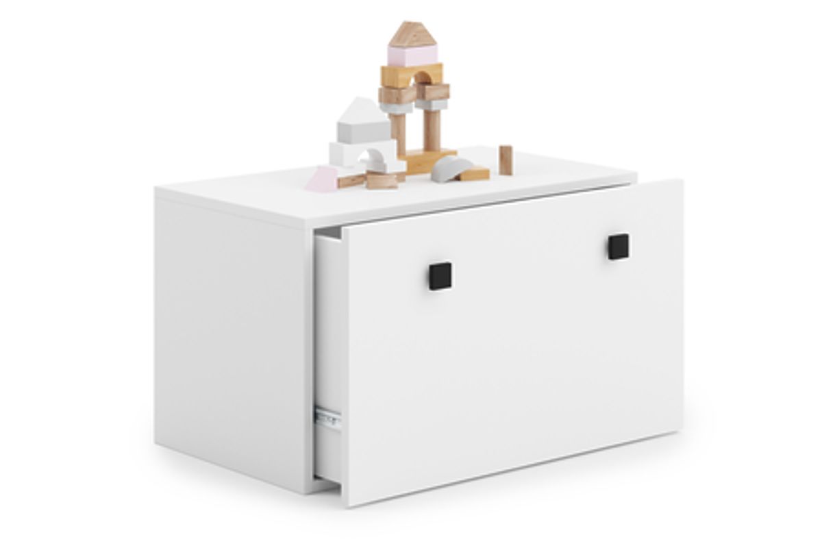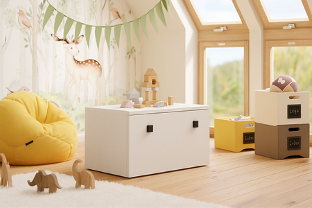 Geräumige Spielzeugtruhe mit modernem Design und schwarzem Griff. .. mehr