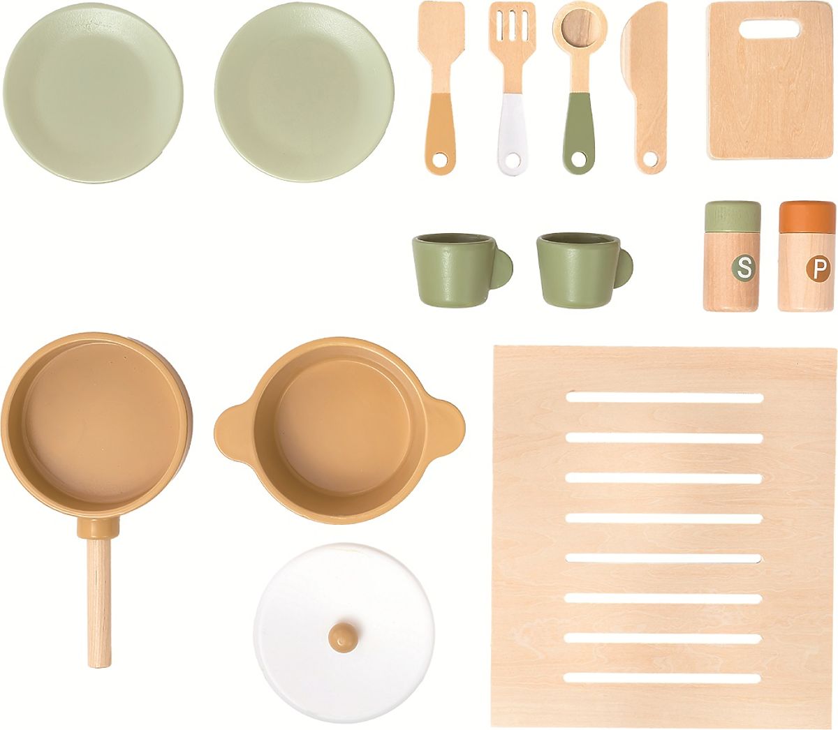 Möchten Sie einen warmen hausgemachten Kuchen? Oder haben Sie vielleicht Lust auf etwas Gebratenes? Mit dieser Küche können Sie ein Menü nach Ihren Wünschen haben. Sie ist nämlich voll ausgestattet! Hier finden Sie alles, was in einer modernen Küche nicht fehlen darf - einen Herd mit Ofen, einen Eiswürfelbereiter, eine Mikrowelle, ein Spülbecken, eine Kaffeemaschine und natürlich Geschirr und Utensilien wie Teller, Topf, Pfanne, Tassen, Messer, Schöpflöffel und mehr. Dank der aufklappbaren Türen und drehbaren Knöpfe wird das Spielerlebnis noch realistischer. Alles ist aus hochwertigem, robustem Holz gefertigt und mit ungiftigen Farben behandelt. Also setzen Sie sich die Kochmütze auf, ziehen Sie die Schürze an und beginnen Sie zu kochen! Lieferumfang: 2x Teller, 2x Tasse, 1x Pfanne, 1x Topf, 1x Deckel, 1x Pfefferstreuer, 1x Salzstreuer, 1x Schneidebrett, 4 Stück Utensilien, Ofenrost. Hauptmerkmale: reichhaltiges Zubehör inklusive, multifunktional, vielseitig einsetzbar, fördert Kommunikations- und Sozialfähigkeiten, motiviert zu fantasievollem Spiel, geeignet für Kinder ab 3 Jahren