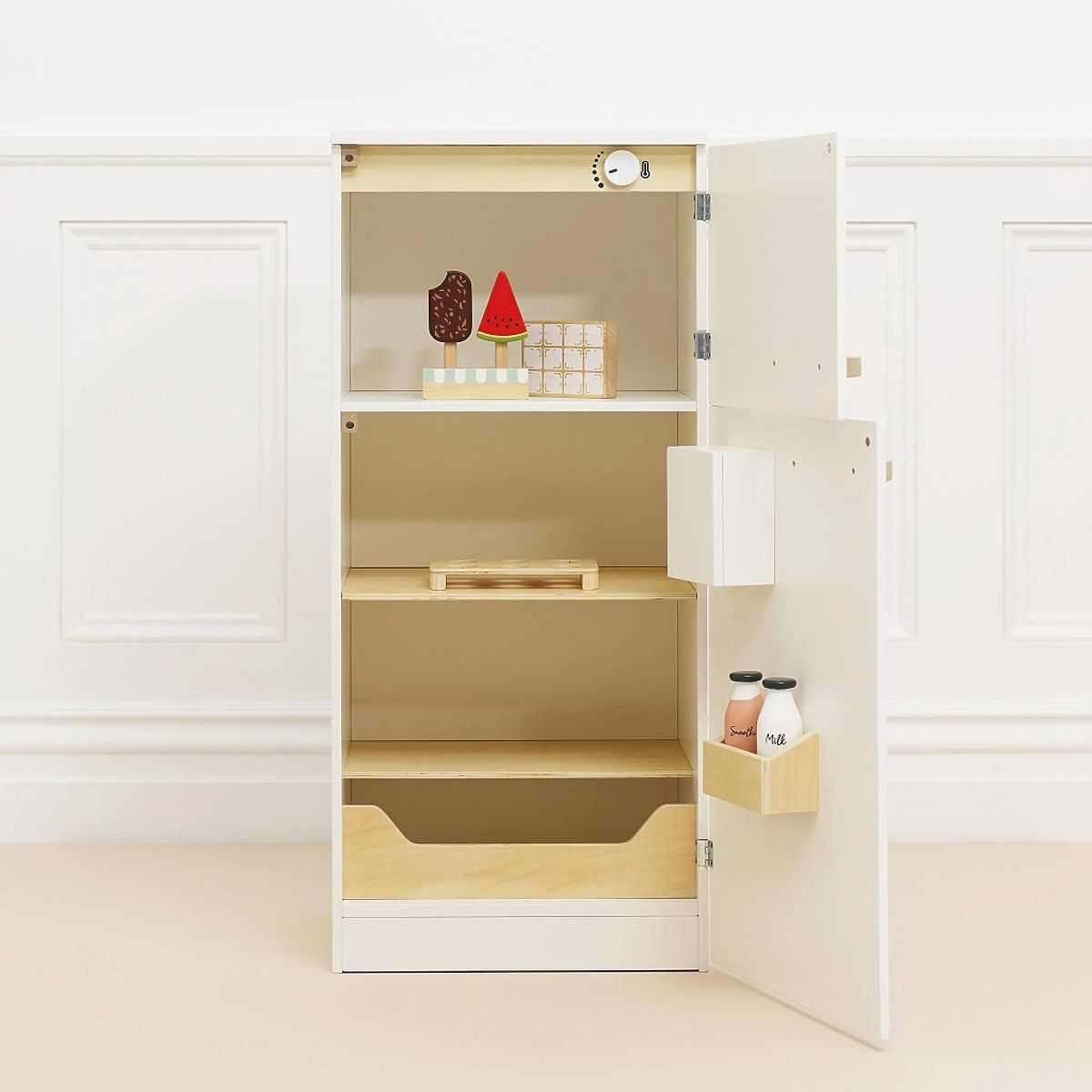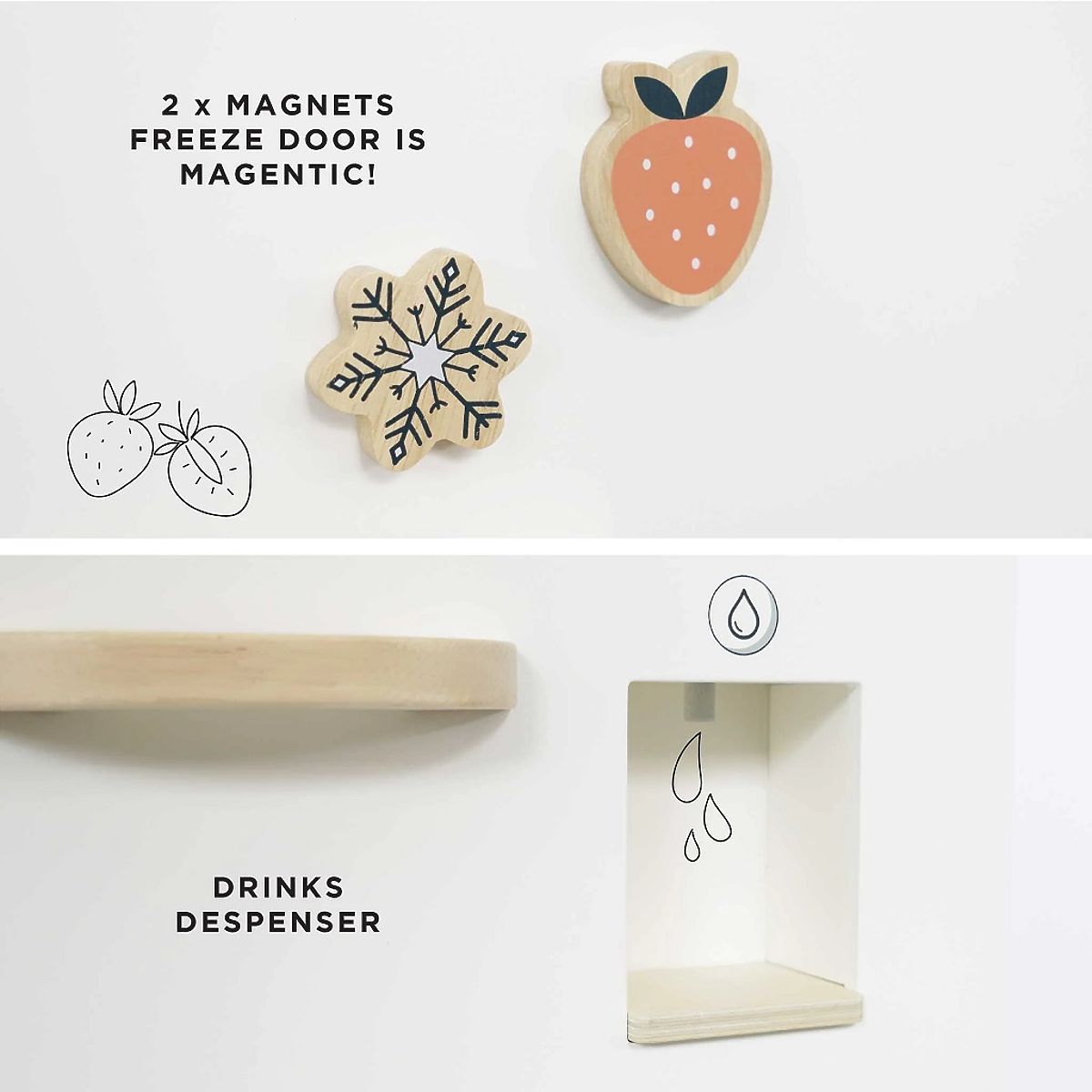 Verbessern Sie Ihre Spielküche mit diesem fantastischen freistehenden Kühlschrank mit Gefrierfach! Das robuste Spielzeug mit attraktivem Retro-Design ist voller interaktiver Funktionen für mehr Spaß und fantasievolles Rollenspiel. Entdecken Sie den eingebauten Wasserspender, die Temperaturregelung oder die Fächer für Obst und Gemüse. Das komplette Set kommt auch mit einer Reihe von Zubehör, darunter 2 Eis am Stiel, ein Ständer, Eier- und Eiswürfelschalen sowie eine Milch- oder Smoothie-Flasche. Die Kühlschranktüren sind magnetisch und es gibt zusätzlich zwei praktische, dekorative Magnete. Der Kühlschrank ist kompatibel mit der großen Le Toy Van Küche (Code TV347). Das Set ist aus FSC®-zertifiziertem Holz (Holz aus nachhaltig bewirtschafteten Wäldern) gefertigt und mit kinderfreundlichen, wasserbasierten Farben verziert. Spielzeuge mit ZweckAlle Spielzeuge von Le Toy Van sind langlebig konzipiert. Sie werden liebevoll von erfahrenen Handwerkern unter Verwendung ethischer Praktiken und nachhaltiger Materialien entworfen, die freundlicher zu unserem Planeten sind. Hauptmerkmale: ethisch aus FSC-nachhaltigem Holz hergestelltmit ungiftigen, wasserbasierten Farben bemaltnach den strengsten Standards getestetenthält Kühlschrank mit Gefrierfach, 2 Magnete, Eiswürfelschale, Eierschale, 2 Eis am Stiel, 2 Flaschen, Wasserspenderinspiriert zu fantasievollem Spiel   Die Marke und das FSC®-Zertifikat (Forest Stewardship Council) garantieren, dass das Holz, aus dem das Produkt hergestellt wurde, nicht illegal geschlagen wurde und aus Wäldern stammt, die schonend oder naturnah bewirtschaftet werden, wobei strenge Umwelt- und Sozialanforderungen eingehalten werden. Das FSC®-Label auf dem Produkt bedeutet, dass Sie durch Ihren Kauf helfen, Wälder zu schützen und eine schonende, verantwortungsvolle oder naturnahe Bewirtschaftung zu unterstützen, durch die unsere Wälder stabiler, gesünder, mit einer natürlichen Artenzusammensetzung und besser gegen die negativen Folgen des Klimawandels gewappnet sind.