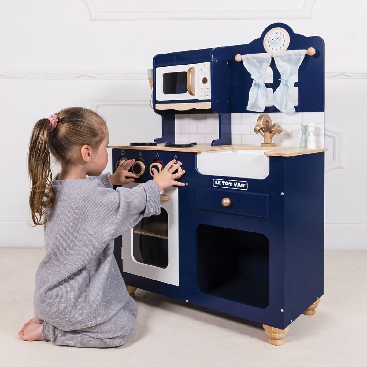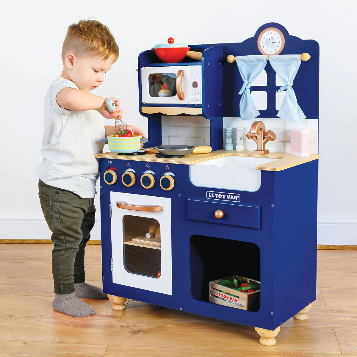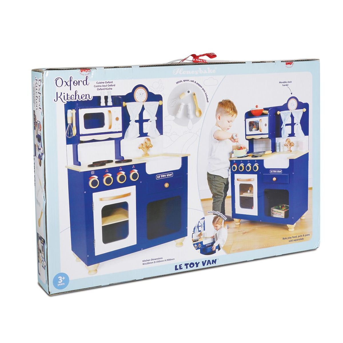 Die Oxford Küche ist aus robustem und nachhaltigem Holz gefertigt, ihr originelles Design macht sie zu einem einzigartigen Stück. Sie ist in königsblau bemalt, ihre Details sind in Kupferfarbe gehalten. Dieses traditionelle Spielzeug passt in jedes Kinderzimmer und begeistert Kinder zu fantasievollem Rollenspiel. Zu ihren Funktionen gehören eine öffnende Ofentür, drehbare Knöpfe, ein Spülbecken, eine Mikrowelle, ein niedliches Fenster mit Vorhängen und eine Uhr mit drehbaren Zeigern. Im Lieferumfang sind außerdem ein Schneebesen, ein Kochlöffel, ein Salz- und ein Pfefferstreuer enthalten. Alles für kleine Chefköche und Chefköchinnen. Die Küche kann mit Lebensmitteln und Zubehör aus der Honeybake-Kollektion von Le Toy Van ausgestattet werden. Ein schönes Spielzeug, das von Generation zu Generation weitergegeben werden kann. Spielzeug mit ZweckAlle Spielzeuge von Le Toy Van sind darauf ausgelegt, lange zu halten. Sie werden liebevoll von erfahrenen Handwerkern entworfen, die ethische Praktiken und nachhaltige Materialien verwenden, die unserer Erde zugutekommen. Hauptmerkmale: Holzküche mit Zubehör, ethisch aus nachhaltigem Holz hergestellt, nach den strengsten Standards getestet, mit ungiftigen, wasserbasierten Farben bemalt, inspiriert zu kreativem und fantasievollem Spiel, hilft bei der Entwicklung von Sprach- und Sozialkompetenzen, unterstützt die frühe Entwicklung. Honeybake Kollektion: Spielzeuge in dieser Kollektion sind ideal zum Entdecken und helfen Kindern, ihre Fantasie, sozialen und verbalen Fähigkeiten sowie kognitive Funktionen zu entwickeln. Traditionelles Design mit modernen Details wird Kinder sicherlich begeistern. Honeybake ist die preisgekrönteste Kollektion von Le Toy Van, ausgezeichnet für Design, Qualität, Sicherheit sowie Bildungs- und Spielwert.
