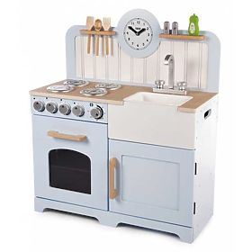 Junge angehende Köche werden das Kochen und Backen mit dieser Holzküche genießen! Sie ist mit vier Kochplatten ausgestattet, die mit Drehknöpfen bedient werden, die ein Klickgeräusch erzeugen. Außerdem enthält sie einen Ofen mit einem Regal und einem Sichtfenster, damit junge Köche das Essen kontrollieren können. Weiterhin gibt es einen Aufbewahrungsschrank, ein Spülbecken, Geschirr, das aufgehängt werden kann (siehe Bild), Salz und Pfeffer und schließlich eine Uhr mit drehbaren Zeigern. Die Küche hat eine höhere Arbeitsplatte und hält somit wachsenden Kindern viele Jahre. An der Seite befinden sich Griffe für leichteres Greifen. Eine großartige Möglichkeit, Kindern Sicherheit in der Küche und gesunde Ernährung beizubringen. Fördert kreatives und fantasievolles Spiel. Entwickelt Hand-Auge-Koordination und Geschicklichkeit. Nach dem Auspacken muss sie zusammengebaut werden. Hergestellt aus hochwertigen Materialien aus verantwortungsvollen Quellen. Entspricht der europäischen Sicherheitsnorm. Hauptmerkmale: drehbare Klangknöpfe, höhere Arbeitsfläche, leichteres Tragen dank seitlicher Griffe, 3 Stück Küchenutensilien (Salz- und Pfefferstreuer, Plastikschüssel im Spülbecken, Spülmittel), fördert Kreativität und Fantasie.