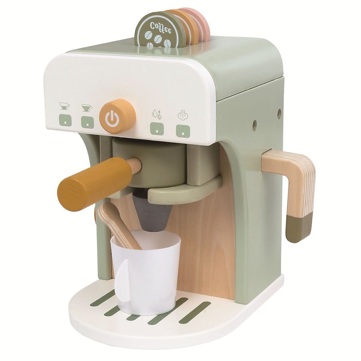 Ein Kaffeemaschinen-Set mit Zubehör für alle kleinen Baristas und zukünftigen Kaffeeliebhaber. Möchten Sie einen Espresso oder Cappuccino? Die Holzhebel-Kaffeemaschine mit realistischen Details verfügt über drei austauschbare Kapseln, eine Tasse, einen Löffel und natürlich einen Kaffeearm, der direkt in das Gerät eingesetzt werden kann. Die Kapseln können von den Kindern in die Aussparungen auf der Oberseite der Kaffeemaschine gelegt werden. Das Spielzeug fördert das fantasievolle Spiel, entwickelt die Feinmotorik, die Bewegungskoordination und die sozialen Fähigkeiten. Kinder können alleine spielen oder Gäste in ihrem eigenen Café bedienen. Angenehme Pastell- und Erdtöne zusammen mit hochwertigem Naturholz machen dieses Spielzeug zu einem schönen Accessoire für jedes Kinderzimmer. Lieferumfang: Kaffeemaschine, Kaffeearm, 3 Kapseln, Tasse, Löffel. Hauptmerkmale: Hebel-Kaffeemaschine mit Zubehör, realistisches Design und funktionale Details, fördert fantasievolles Spiel, entwickelt Feinmotorik und Koordination, Naturholz in Kombination mit Erdtönen, ideal als Ergänzung für die Kinderküche, geeignet für Kinder ab 2 Jahren.