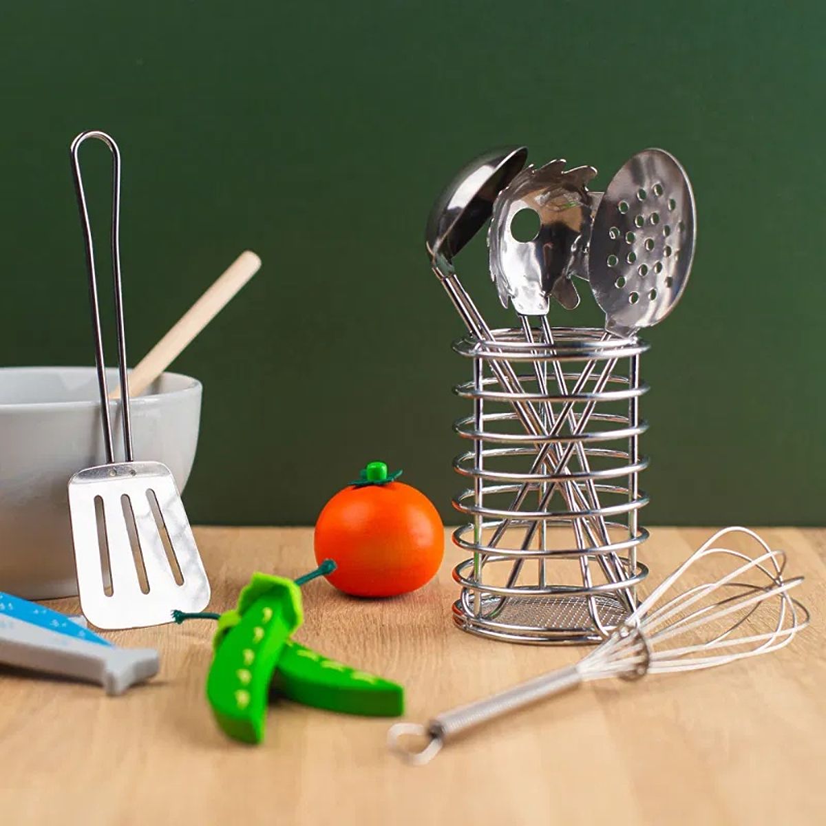 Mit dem Küchengeräte-Set wird das Kochen und Backen zum Kinderspiel! Das Set für kleine Köche und Köchinnen enthält sechs Kinderutensilien, darunter einen Pfannenwender, einen Schaumlöffel, eine Schöpfkelle, einen Schneebesen, einen Spaghettilöffel und einen Kochlöffel, die in einem praktischen zylindrischen Behälter aufbewahrt werden. Kinder können schlagen, rühren und servieren und verschiedene Küchenaktivitäten ausprobieren, um ihre Kreativität zu fördern. Rollenspiele sind eine großartige Möglichkeit, soziale Intelligenz, Sprachfähigkeiten, kreatives Denken und Kommunikationsfähigkeiten zu entwickeln. Der Umgang mit Küchengeräten verbessert die Feinmotorik und die Hand-Auge-Koordination. Die Utensilien sind aus hochwertigen Materialien aus verantwortungsvollen Quellen gefertigt und mit ungiftigen Farben und Lacken bemalt. Sie entsprechen den aktuellen europäischen Sicherheitsnormen. Hauptmerkmale: 6 Stück Küchengeräte im Behälter: Pfannenwender, Schaumlöffel, Schöpfkelle, Schneebesen, Spaghettilöffel und Kochlöffelentwickelt soziale Intelligenz, Sprachfähigkeiten, kreatives Denken und Kommunikationsfähigkeitenverbessert die Feinmotorik und die Hand-Auge-Koordinationunterstützt Rollenspieleaus hochwertigen Materialien gefertigtgeeignet ab 3 Jahren