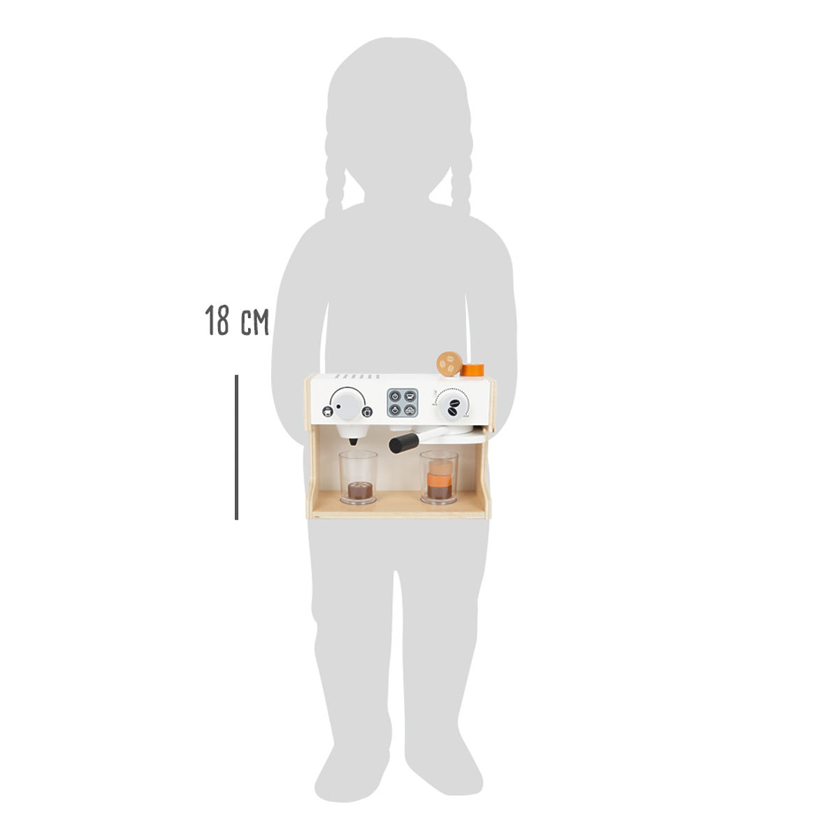 Haben wir hier junge Baristas? Mit dieser professionellen Kaffeemaschine aus Holz können Sie auch in Ihrer Kinderküche perfekten Kaffee zubereiten. Zwei Zifferblätter klicken beim Drehen, der Teil mit dem Kaffeefilter ist drehbar. Sie können verschiedene Kaffeesorten zubereiten. Auf der Rückseite befindet sich eine Tafel, auf die Sie Ihr Tagesangebot schreiben können. Eine moderne Kaffeemaschine mit Milchaufschäumer, dank der Sie Kaffee wie die Eltern trinken können! Das Spielzeug fördert die Entwicklung der Motorik und das Rollenspiel. Hauptmerkmale: klickende, drehbare Knöpfe, Kreidetafel für das Tagesangebot, fördert aktives Rollenspiel, Motorikentwicklung