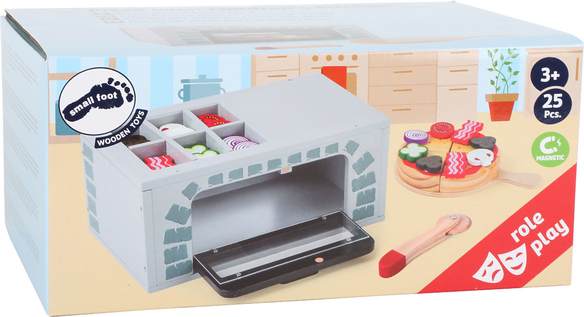 Pizza backen wie die Großen! Kleine Bäcker können hier ihre eigene Pizza backen und dank Klettverschlüssen nach eigenem Geschmack dekorieren (Zwiebeln, Pilze, Tomaten, Gurken, Speck, Oliven). Mit der Holz-Pizzaschaufel wird sie in den Ofen geschoben, der mit beweglichen Türen geöffnet und geschlossen werden kann. Die Zutaten sind in übersichtlichen Fächern im oberen Teil des Ofens untergebracht. Nach dem Backen kann die Pizza mit einem Schneider in vier gleiche Teile geteilt werden. Wer bekommt noch Hunger? Hauptmerkmale: Öffnende Ofentüren, Pizzazutaten mit Klettverschluss verbunden, trainiert die Motorik, fördert aktives Rollenspiel und die Entwicklung sozialer Fähigkeiten beim Spielen.