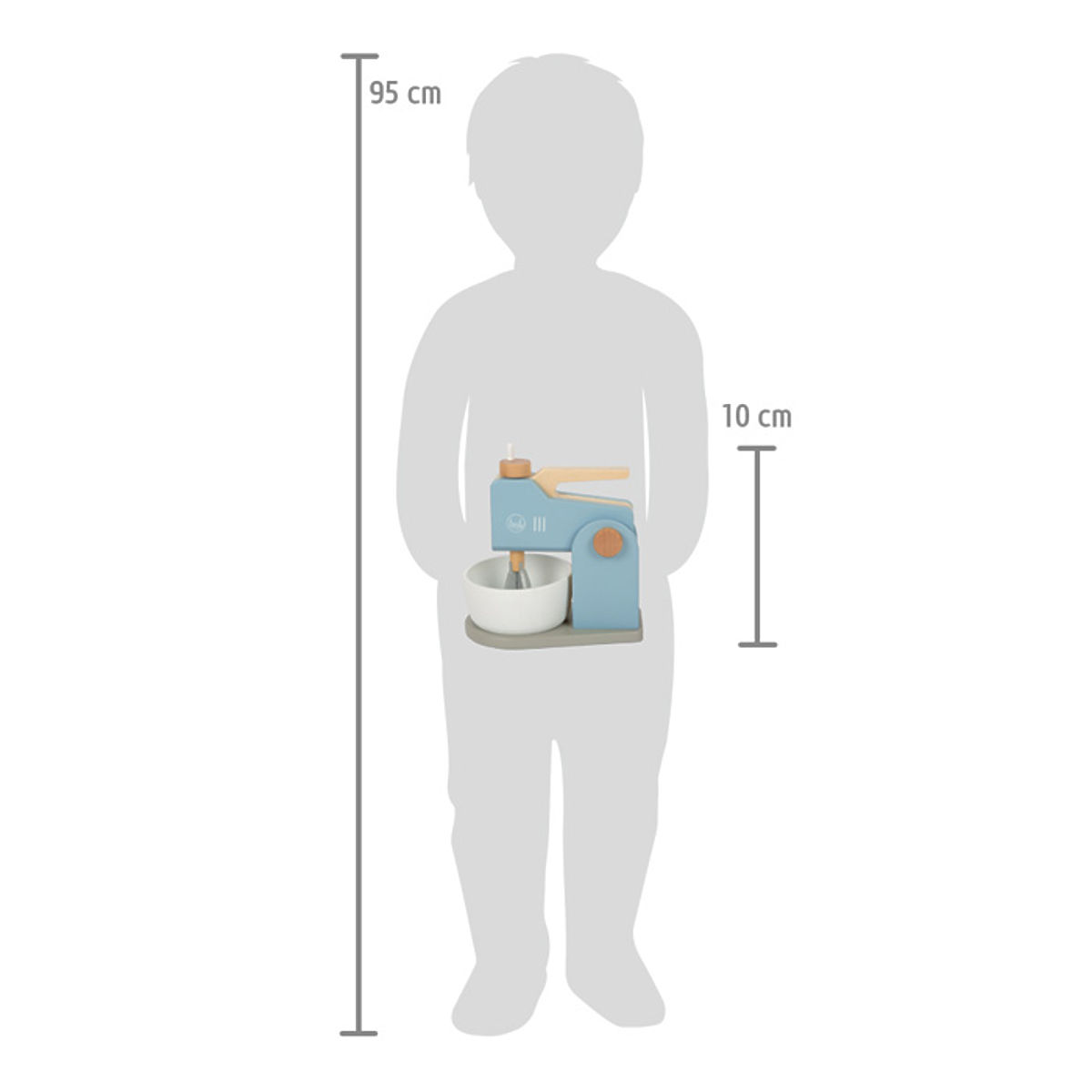 Mit dieser hölzernen Küchenmaschine mit Zubehör werden kleine Bäcker und Bäckerinnen viel Spaß haben. Der Handmixer kann von der Maschine getrennt werden, das Spielzeug hat eine schöne blaue und weiße Farbe, enthält aber auch viel natürliches Holz. Im Set finden Sie auch eine Box mit Backmischung, die einen Gummiverschluss hat und kindersicher ist. Nach dem Bildrezept in der Box können Sie Ihre eigenen Leckereien backen. Außerdem enthält das Set Stoffkekse, Holzbutter, ein Ei mit Klettverschluss, eine Schüssel, einen Teigroller, einen Spatel und ein Backblech. Dieses Set hat ein farbenfrohes Design, das mit anderen Produkten der Tasty-Reihe von Small Foot kompatibel ist, wie zum Beispiel der Holzküche LE12216. Hauptmerkmale: hölzerne 2-in-1-Küchenmaschine in rauchblau, weiß und viel natürlichem Holz drehbare Rührbesen Textil- und Holzaccessoires – Lebensmittel und Küchenausstattung Box mit Backmischung, inklusive Bildrezept passt mit seiner Farbe und seinem Design sowohl ins Kinder- als auch ins Wohnzimmer passt zu weiteren Produkten der Tasty-Produktreihe fördert beim fantasievollen Spiel Alltags- und Sozialkompetenzen
