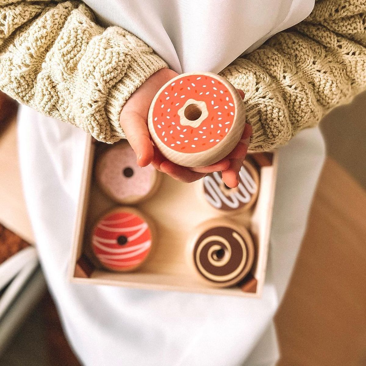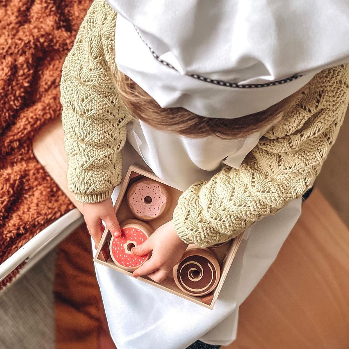 Holzbox mit Donuts, die realistisch und sehr lecker aussehen. Sie können sie selbst essen oder mit anderen teilen! Ein ideales Spielzeug, das Kindern die Möglichkeit der Wahl und des Teilens näherbringt. Perfektes Spielzeug für Teepartys oder Picknicks. Fördert die Kreativität und Rollenspiele der Kinder. Hergestellt aus hochwertigen Materialien aus verantwortungsvollen Quellen. Entspricht den europäischen Sicherheitsstandards. Hauptmerkmale: Box (ohne Deckel) und 6 Donuts, langlebige Ausführung, nachhaltig hergestellt.
