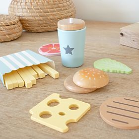 Gesunder Hamburger und Pommes? In Form eines Holzspielzeugs schadet es dem Kinderbauch nicht und belebt die Spielecke. Mit diesem Set wird das Spiel als Koch zu einem realistischeren Erlebnis und in Kombination mit anderen Sets können Sie einen Ort voller Spaß schaffen.