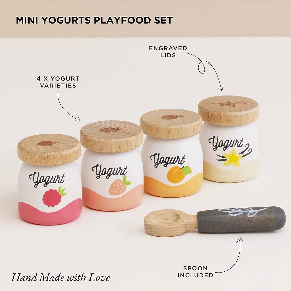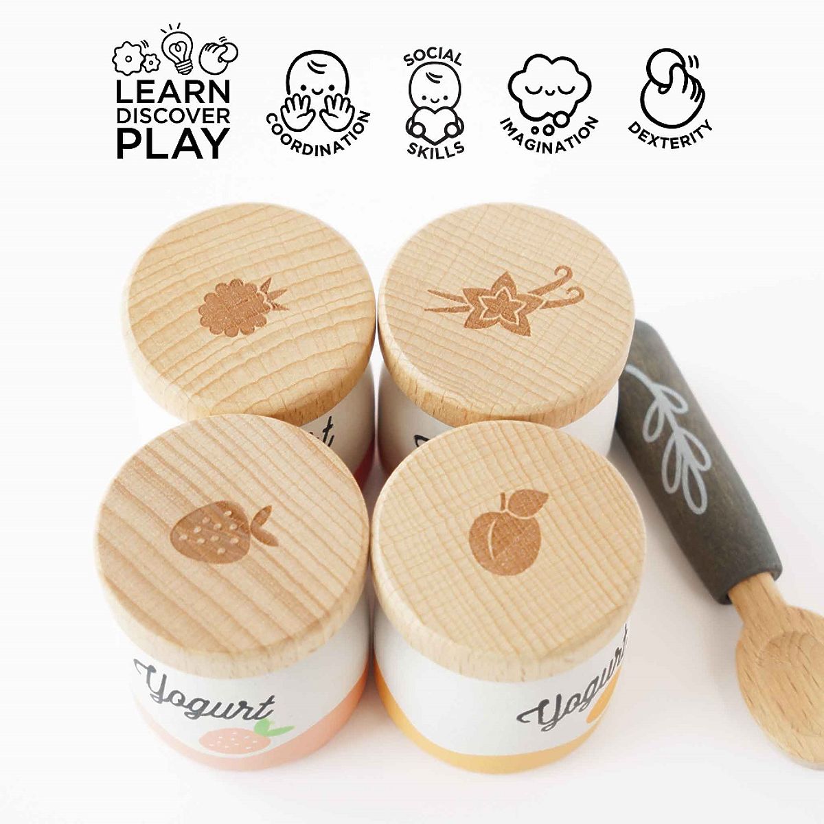 Holzspielzeugessen mit vier Joghurtattrappen und einem Löffel. .. mehr