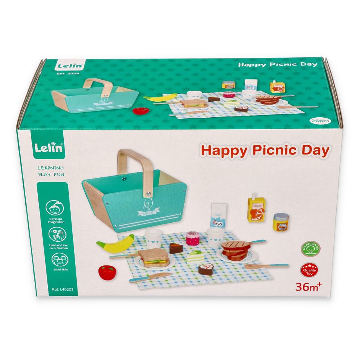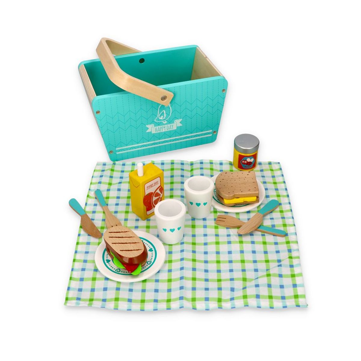 Das gesamte Set ist in einem schönen Korb verpackt, der komplett aus Holz besteht. Die schöne Minzfarbe und der Druck an der Seite verleihen Charme. Der passende Servietten, auf dem die Elemente ausgelegt werden können, ist ebenfalls ein Vorteil dieses Produkts. Laden Sie Teddybären und Freundinnen zu einem gemeinsamen Ausflug außerhalb der Stadt ein oder machen Sie ein Picknick im Zimmer, auch wenn das Wetter nicht zum Campen einlädt.