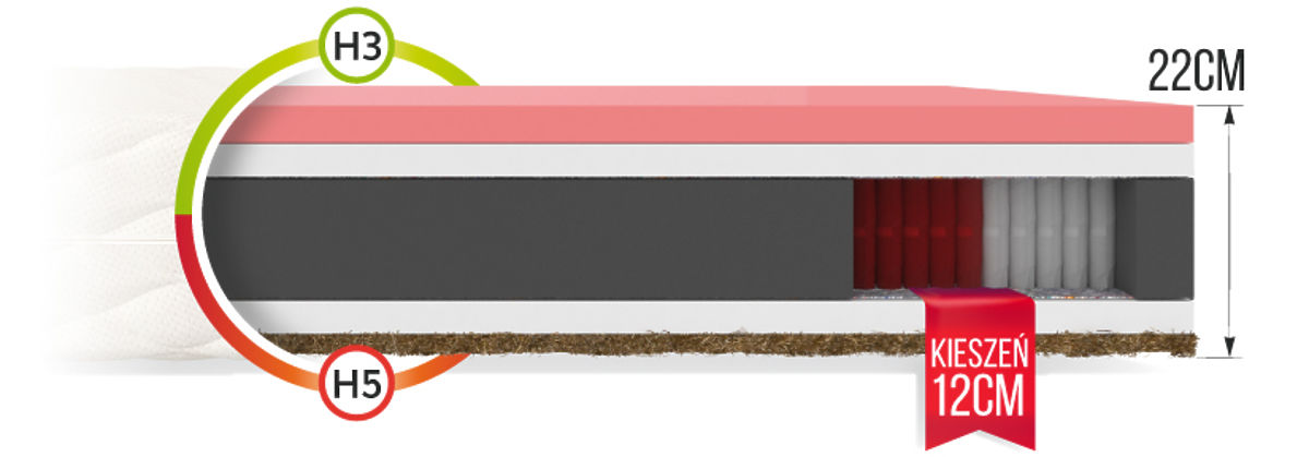 Die Federn sind mit der NanoHard- Technologie hergestellt, die Festigkeit garantiert und die Lebensdauer verlängert. Die zweite Schicht besteht aus strapazierfähigem und flexiblem Purschaum , der für eine gute Körperdämpfung und eine hochwertige Unterstützung der Wirbelsäule sorgt. Ihr Körper passt sich perfekt an die Matratze an und Sie wachen morgens ausgeruht und erholt auf. Darüber hinaus sorgt der thermoplastische VISCO-Schaum dank Formgedächtnis für unübertroffenen Komfort und Bequemlichkeit. Es bildet den Körper perfekt ab und kehrt später in seinen ursprünglichen Zustand zurück. Um zusätzliche Atmungsaktivität zu gewährleisten, wurde eine Kokoseinlage verwendet, die als Naturmaterial die gesamte Struktur leicht verstärkt. Zwischen Federn und Schaumstoff wurde ein Trennmaterial eingelegt. Hierbei handelt es sich um einen Naturfilz, der die Lebensdauer der Matratze erheblich verlängern und ihre Konstruktion stärken kann.
