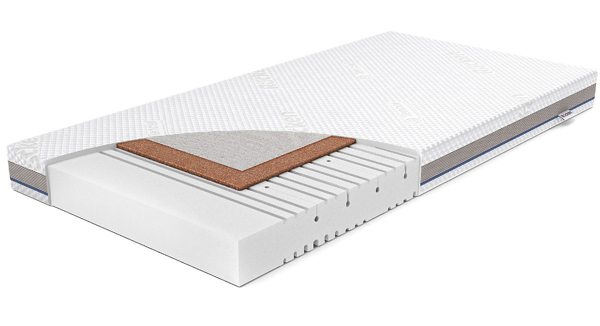 Die Matratze besteht aus profiliertem PUR-Schaum mit einer Dicke von 9 cm + Kokosmatte 1 cm