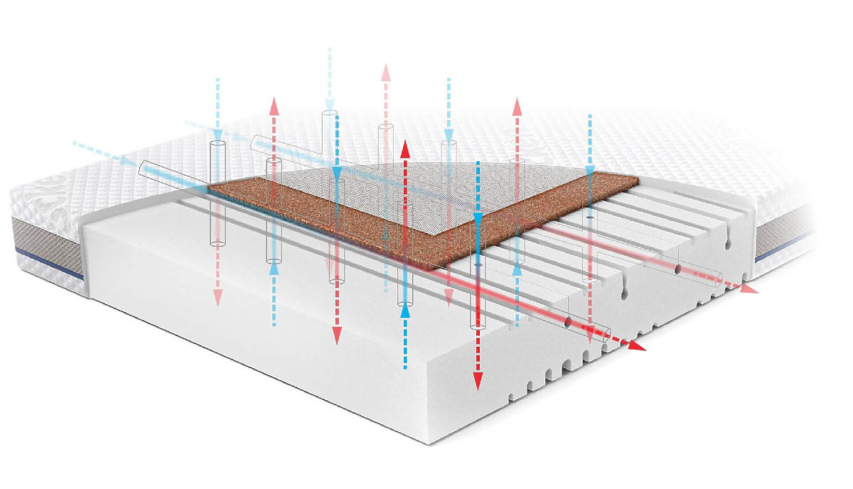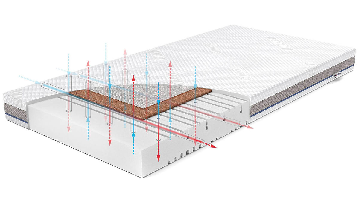 Der Bezug und die vertikalen und horizontalen Kanäle sind vollständig integriert - dadurch entsteht ein erweitertes Netz und die Matratze atmet.