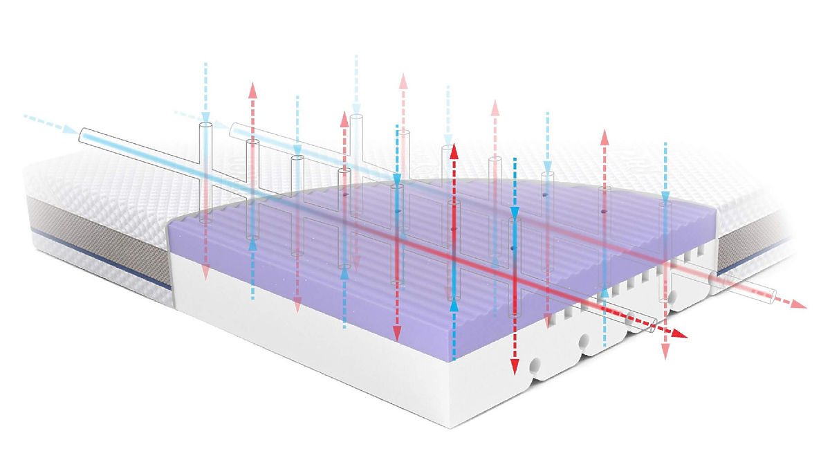 Der Bezug und die vertikalen und horizontalen Kanäle sind vollständig integriert - dadurch entsteht ein umfangreiches Netz und die Matratze atmet.