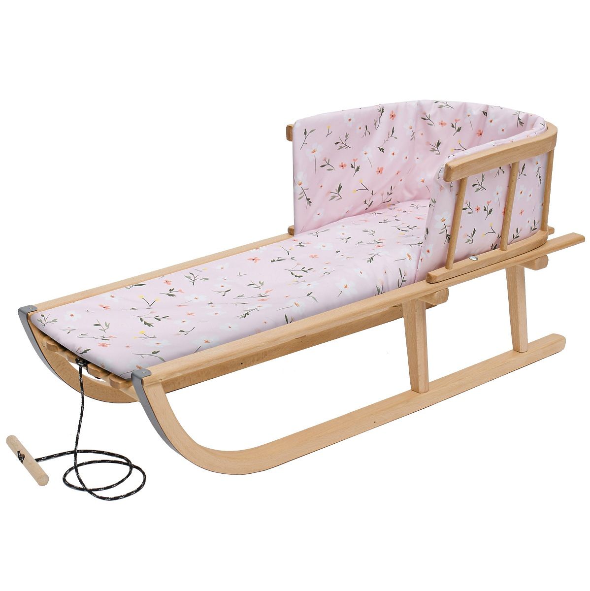 Der schöne Holzschlitten mit rosa Polsterung wird sicher allen kleinen Mädchen gefallen, die gerne Schlitten fahren. Das zarte Blumenmuster und die Rosatöne verleihen dem Schlitten Eleganz und machen den Winterspaß der Kinder zu einem außergewöhnlichen Erlebnis.