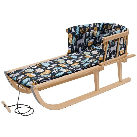 Holzschlitten mit Polsterung , auf denen sich ein wunderschönes und unwiderstehliches Motiv des Waldes befindet, werden sicherlich allen Naturliebhabern und insbesondere dem Schlittenfahren gefallen. Das außergewöhnliche Muster mit Tieren und einer Waldlandschaft wird sowohl Jungen als auch Mädchen gefallen. Dieser Schlitten macht den Winterspaß für Kinder zum lustigsten Erlebnis.
