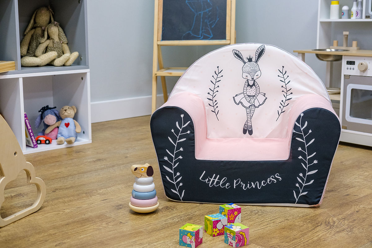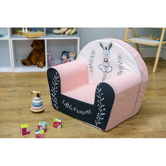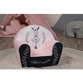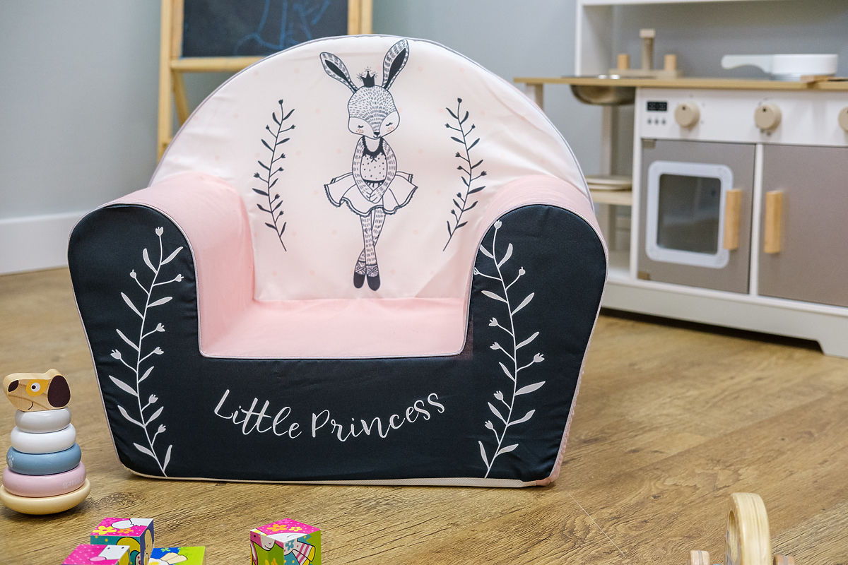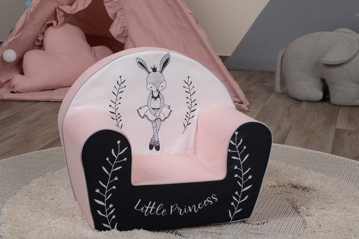 Farbenfroher Sessel mit Hasen-Ballerina-Motiv. Beleben Sie den Raum dank der Kombination aus weißem und rosafarbenem Stoff, die Mädchen auf den ersten Blick lieben werden. Auf der Vorderseite des Stuhls befindet sich eine schöne Inschrift Little Princess . Der Kinderstuhl besteht aus weichem und leichtem Schaumstoff. Dadurch ist es sicher und praktisch für den täglichen Gebrauch.