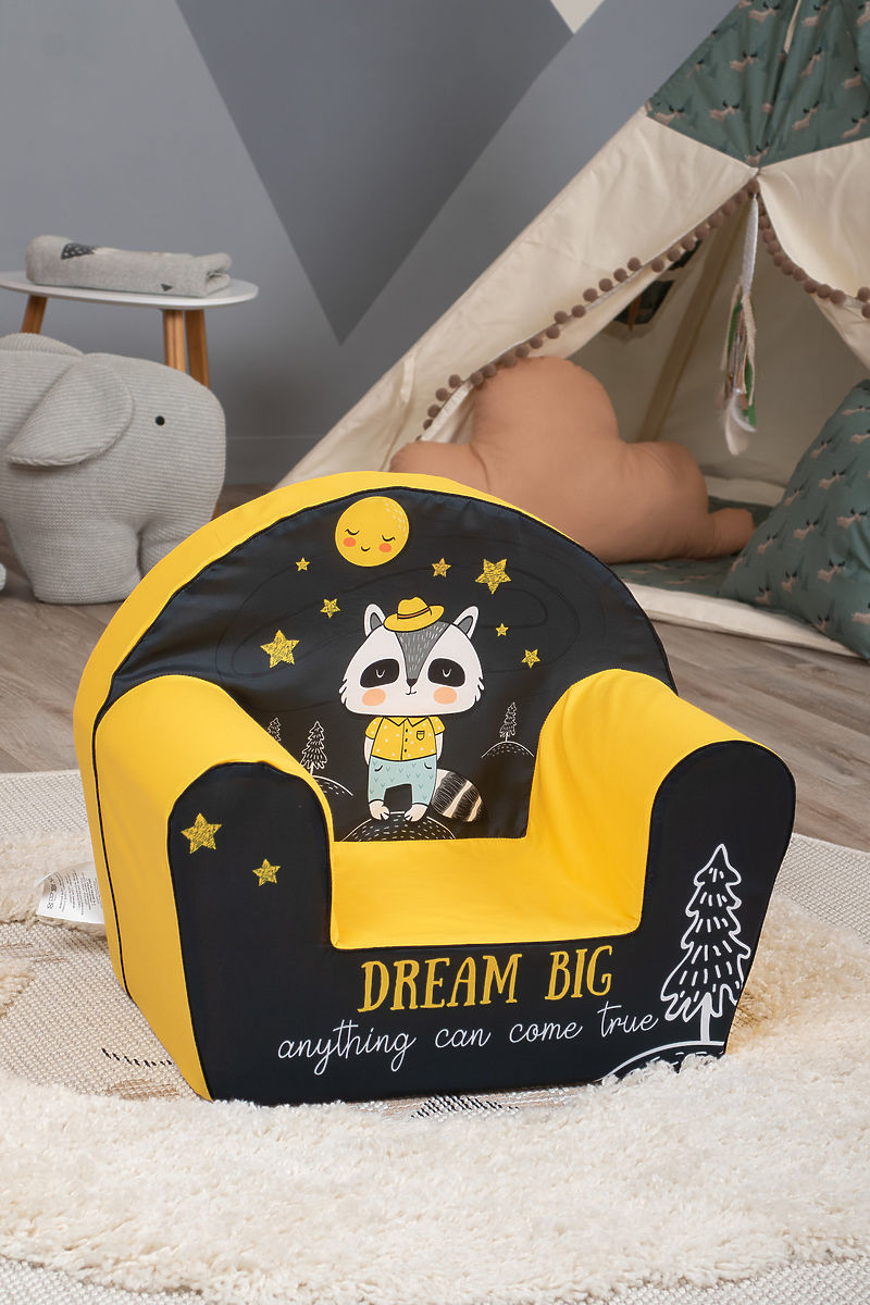 Schwarz-gelber Stuhl mit einem niedlichen Waschbär-Motiv im nächtlichen Wald. Auf dem Stuhl steht DREAM BIG anything can come true. Der Kinderstuhl ist aus weichem und leichtem Schaumstoff gefertigt. Dadurch ist er sicher und praktisch für den täglichen Gebrauch.