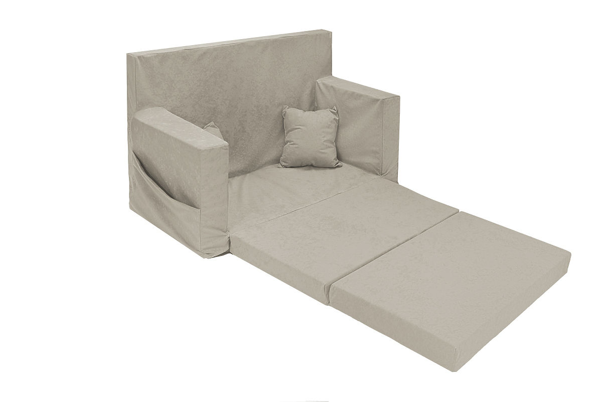 Das hellgraue Kinderschlafsofa besteht aus weichem und leichtem Schaumstoff. Das Kind kann es ohne Ihre Hilfe leicht bewegen, auf- und zusammenklappen.