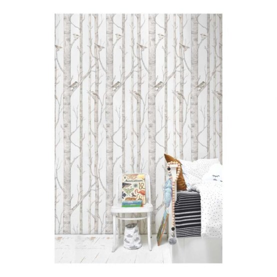 Originelle, trendige Tapete im Scandi-Stil mit Birken- und Vogelmotiven aus einem Material, das eine einfache Anwendung gewährleistet.