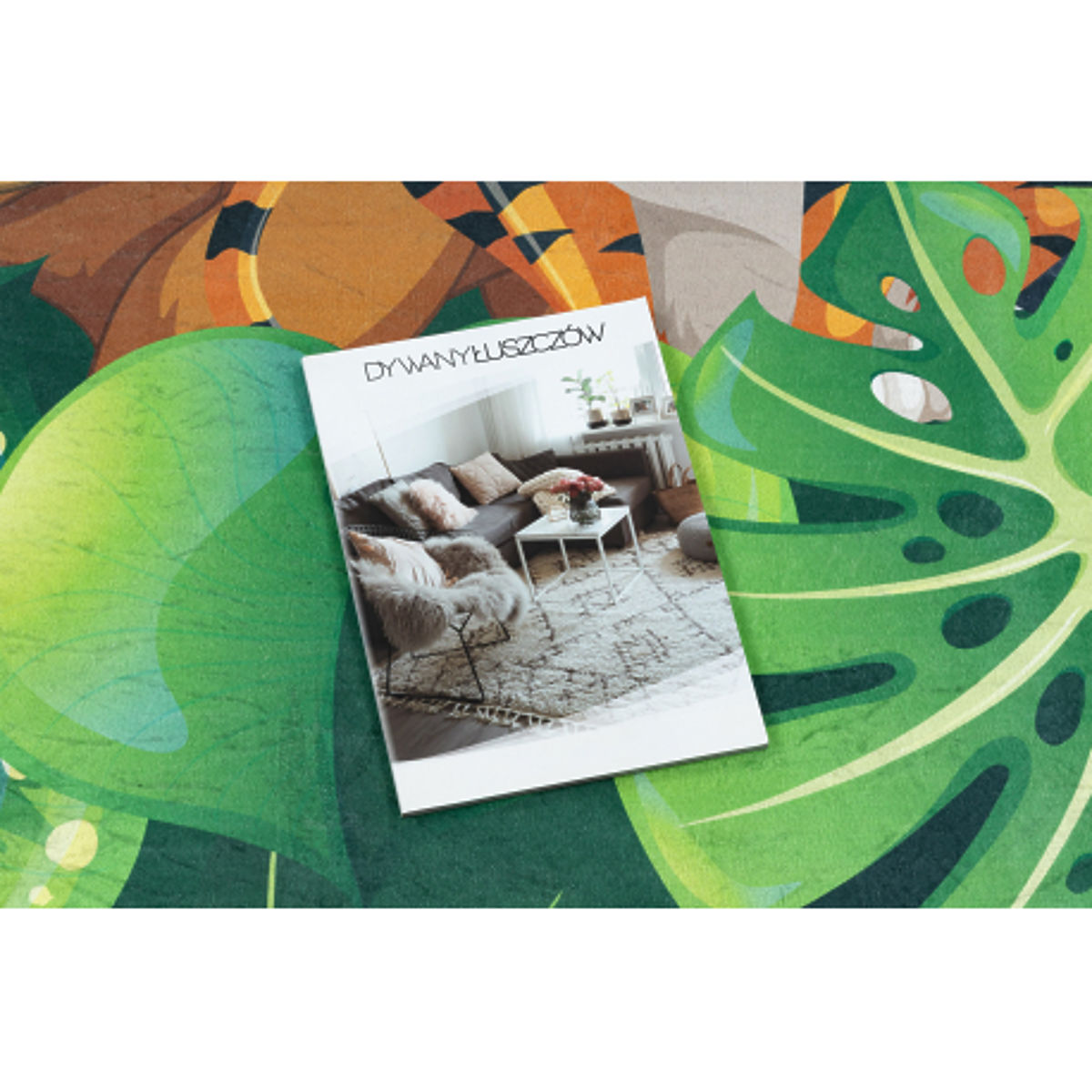 Bringen Sie eine tropische Abenteueratmosphäre in das Kinderzimmer mit der Waschmatte BAMBINO 2651, die mit fröhlichen Dschungeltiermotiven begeistert. Die grün-braune Farbkombination verleiht dem Teppich ein angenehm natürliches Aussehen und schafft einen spielerischen Raum voller Fantasie – ideal für tägliches Spielen, Entdecken und Entspannen. Perfekt geeignet für das Kinderzimmer, Spielzimmer oder den Kindergarten, wo er zum beliebten Accessoire des kleinen Entdeckers wird. Der Teppich besteht aus 100% Polyester, das weich, strapazierfähig und angenehm anzufassen ist. Die Dicke von 5 mm bietet Komfort beim Sitzen und Spielen, während das geringe Gewicht von 0,70 kg/m² eine einfache Handhabung gewährleistet. Ein großer Vorteil ist die Maschinenwaschbarkeit, die den Teppich stets sauber hält. Die rutschfeste Unterseite verhindert zudem das Verrutschen auf dem Boden und erhöht die Sicherheit beim Spielen der Kinder.