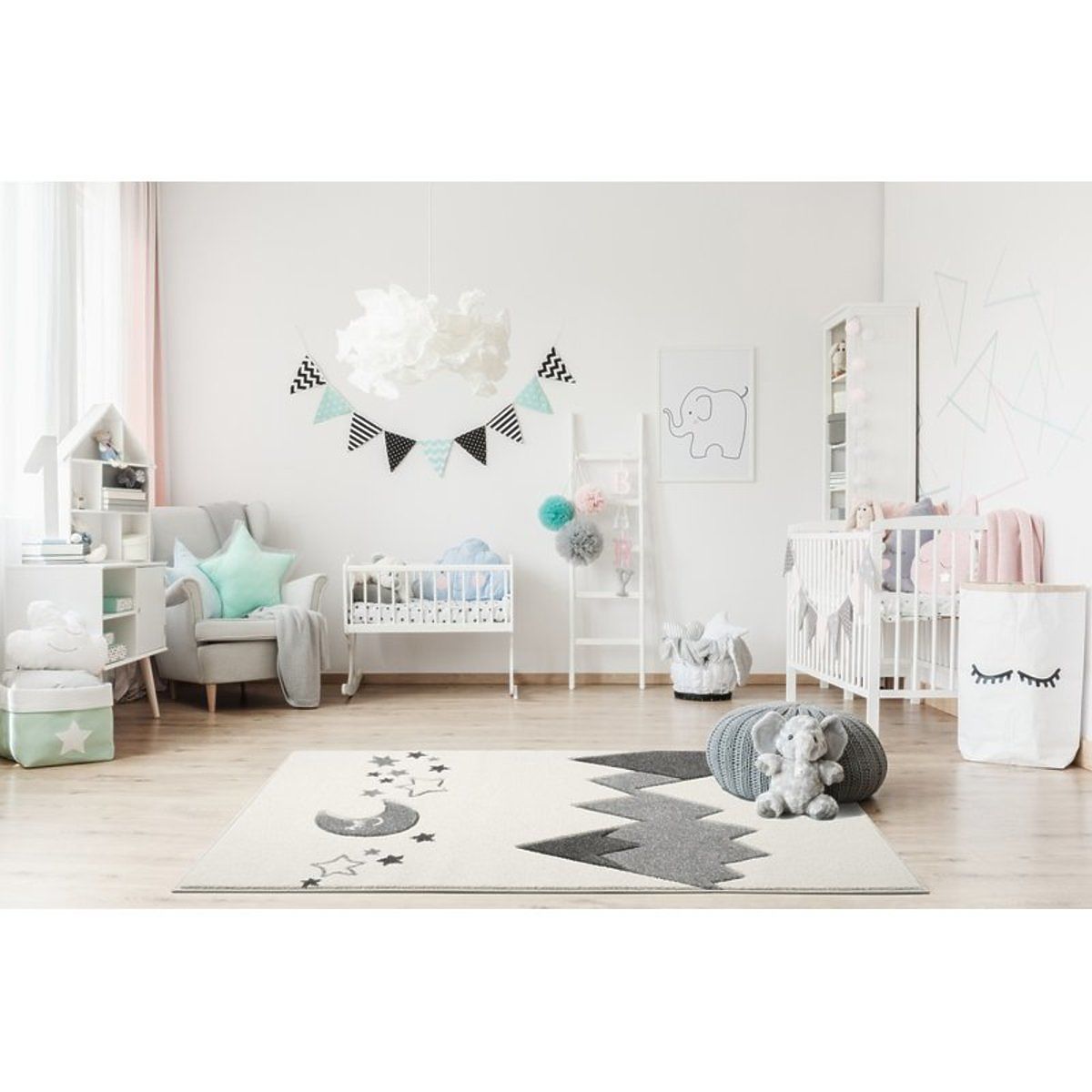 Ein cremefarbener Luxusteppich mit einem Motiv aus Bergen, Mond und Sternchen in Grau aus LIVONE, Deutschland, wird sich in jedes Familienmitglied verlieben. .. mehr