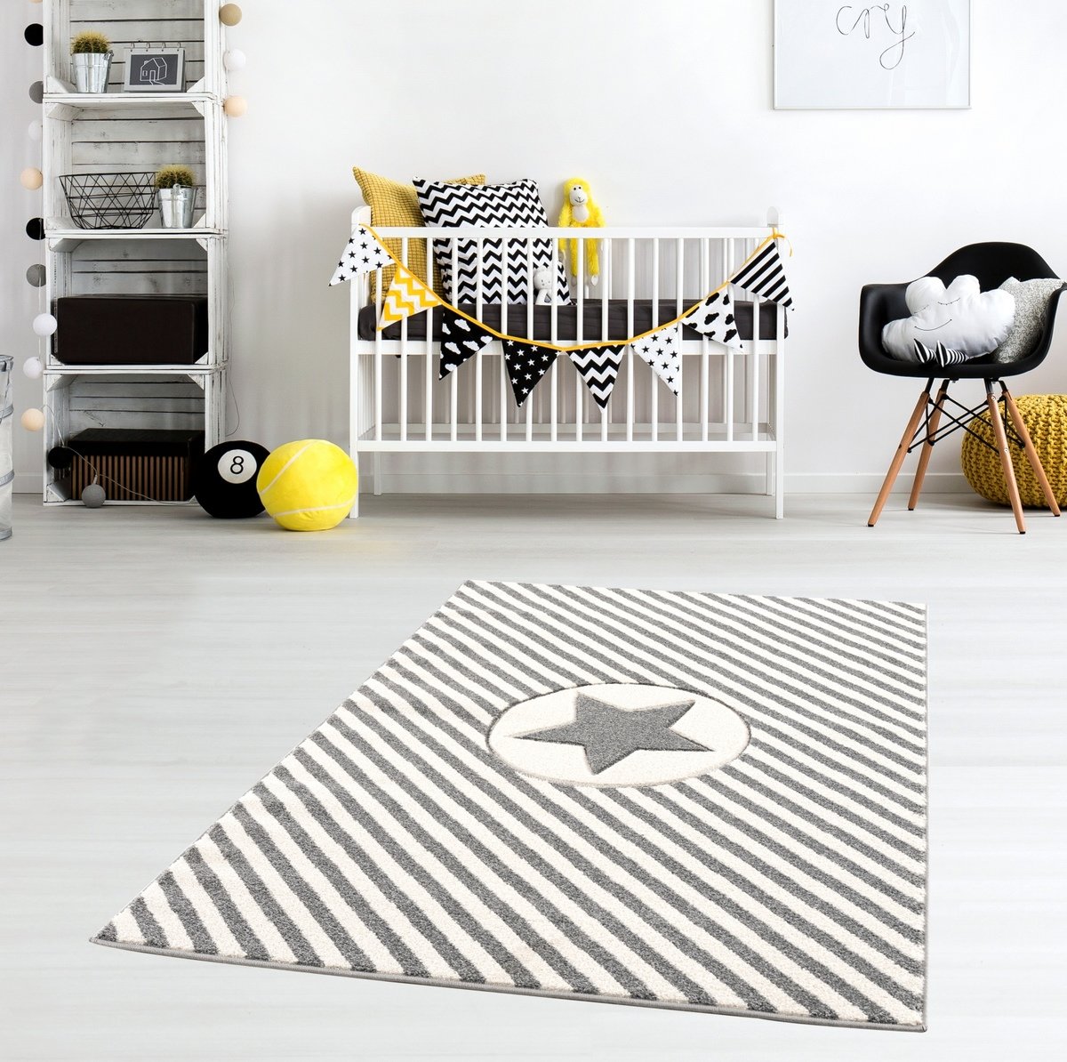 Luxuriöser grauer Teppich mit Sternen und Streifen von der deutschen Firma LIVONE zum Kinder- oder Schülerzimmer. Eigenschaften: - angenehm anzufassen - .. mehr